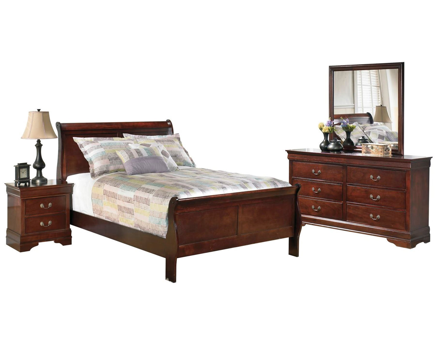 The Ashley Alisdair 4 PC Bedroom Set E King Sleigh Bed One Nightstand Dresser Mirror in Dark Brown The Alisdair e king sleigh bed is the epitome of traditional decor. Louis Philippe-style molding dates back to the mid-19th century when furnishings were lavish yet somewhat simple. Deep finish brings warmth and elegance into the space. Mattress and foundation/box spring sold separately.