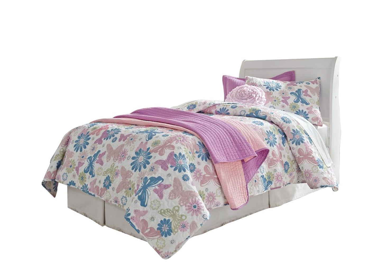 The Ashley Furniture Twin Sleigh headboard crisp in replicated white paint make this twin Sleigh headboard a dream come true in the bedroom. Antiqued pewter color metal hardware complementing the Louis Philippe style. Side roller glide drawer system for smooth operating drawers. Curvaceous footboard panel caped with an elegant sleigh rail. Headboards can attach to a bolt-on metal bed frame twin and full.