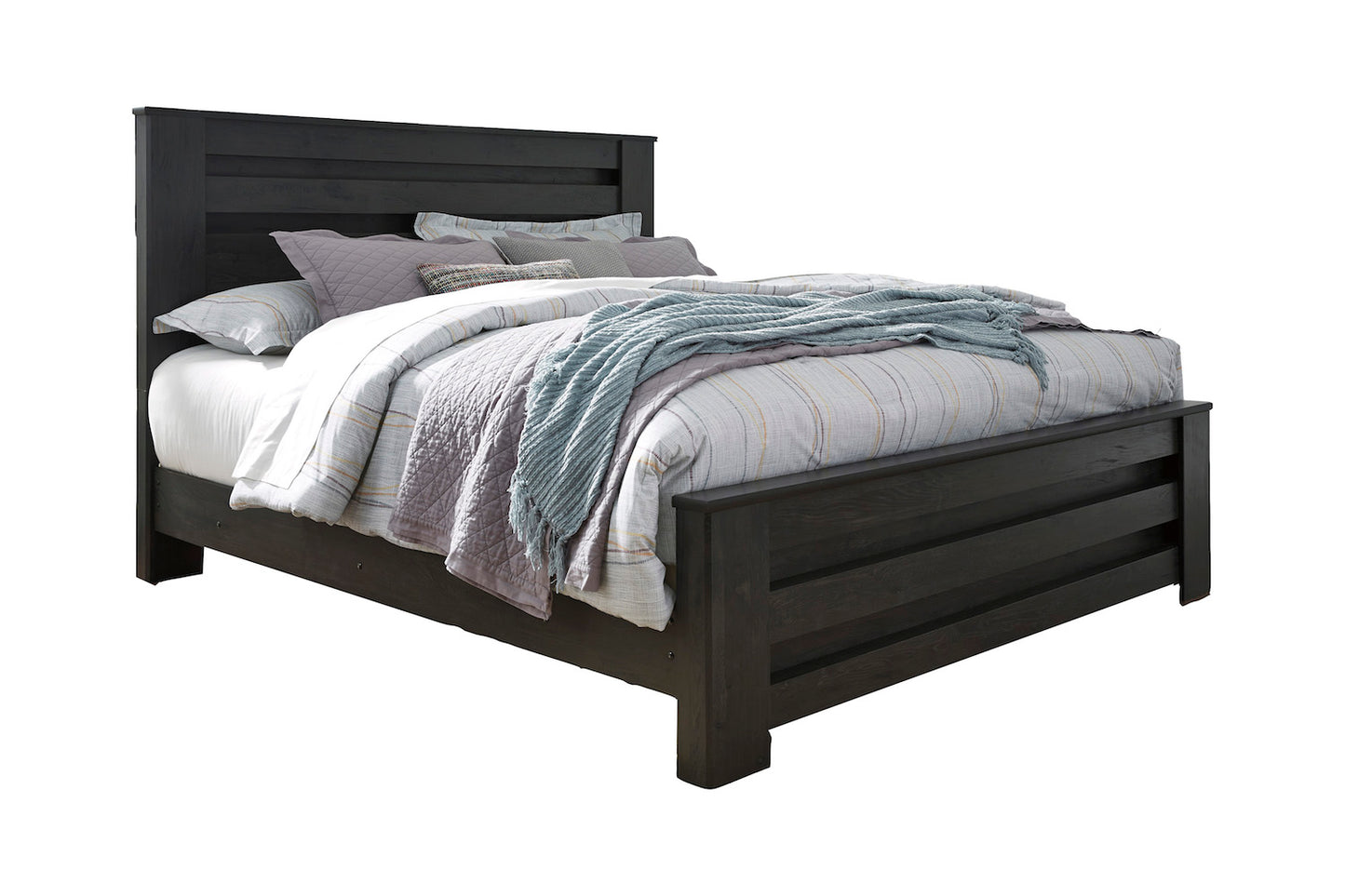 FeaturesSeries Features: Dark charcoal finish over replicated oak grain. Tall generously scaled cases with wide pilaster. Large dark color handles with an aged appearance accent cases. Modern styled deep panel bed enhanced with horizontal pocket details. Side roller glides for smooth operating drawers. Queen/full (67) and king/Cal king (68) headboards can attach to a bolt-on metal bed frame B100-31 or B100-66 respectively.