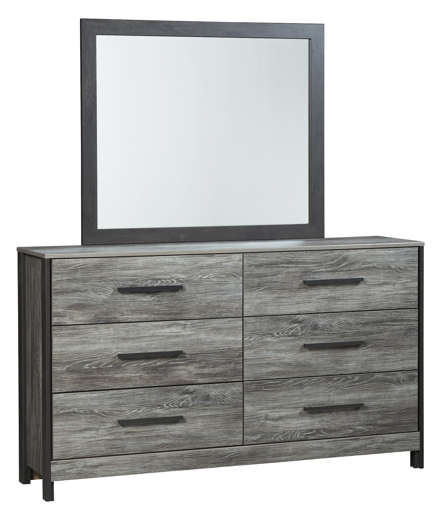 FeaturesSeries Features: Rustic warm gray finish over replicated Oak grain accented with dark charcoal finish over replicated Oak grain. Sleek contemporary handle in a dark gunmetal finish. Cases feature recessed side panels for a contemporary look. Headboards are designed with an open slat design. Side roller glides for smooth operating drawers. Drawer interiors lined with a faux linen laminate for a clean finished look. Slim USB charger located on the back of the night stand tops. Queen and King headboards can attach to a bolt-on metal bed frame or respectively.
