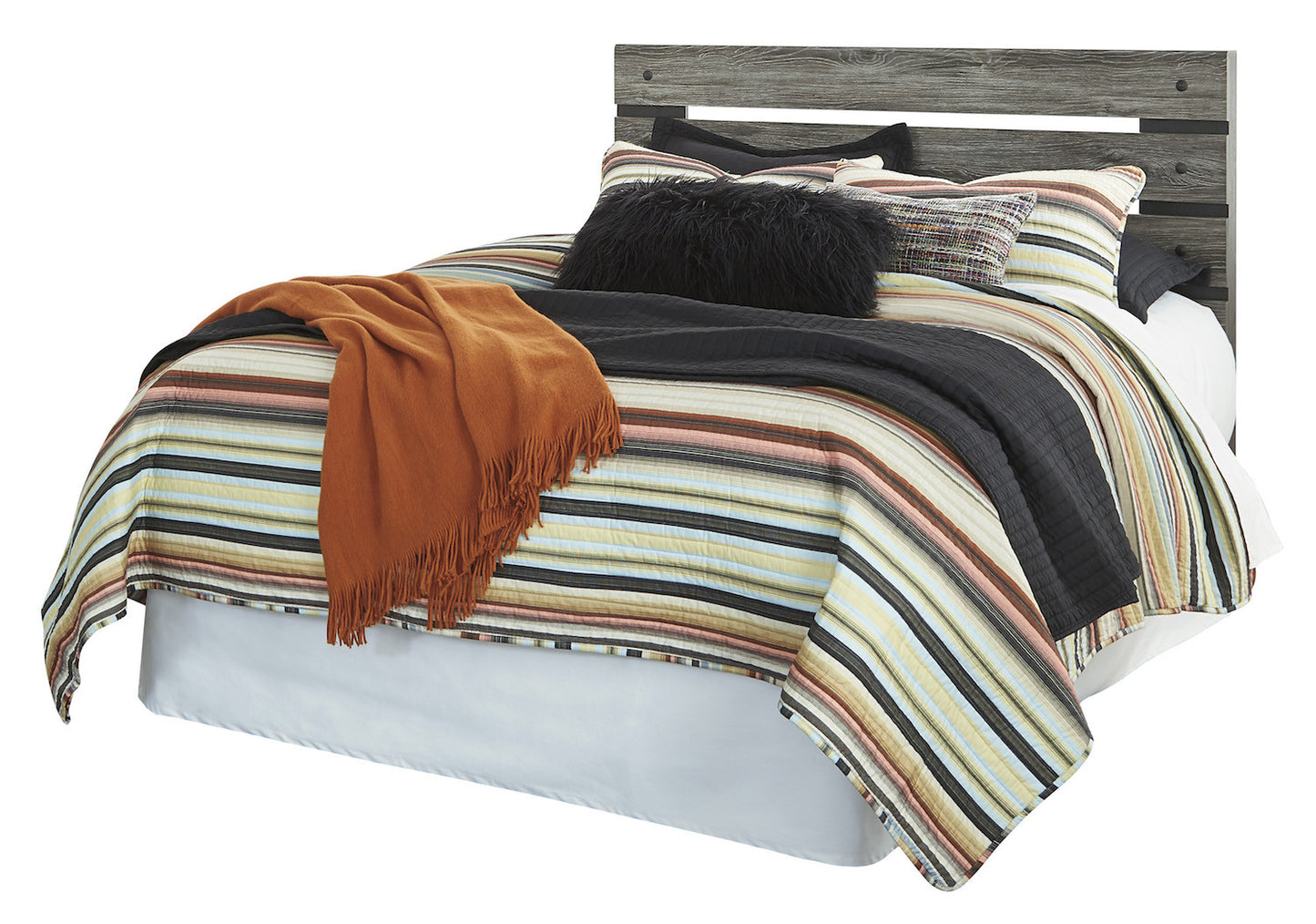 FeaturesSeries Features: Rustic warm gray finish over replicated Oak grain accented with dark charcoal finish over replicated Oak grain. Sleek contemporary handle in a dark gunmetal finish. Cases feature recessed side panels for a contemporary look. Headboards are designed with an open slat design. Side roller glides for smooth operating drawers. Drawer interiors lined with a faux linen laminate for a clean finished look. Slim USB charger located on the back of the night stand tops. Queen and King headboards can attach to a bolt-on metal bed frame or respectively.