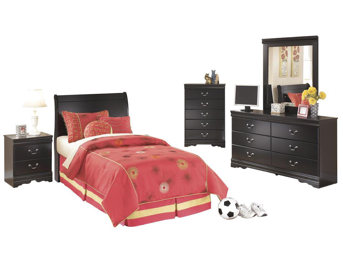 The Ashley Furniture Huey Vineyard 5 piece twin sleigh headboard with chest is the epitome of traditional decor. Louis Philippe-style molding dates back to the mid-19th century when furnishings were lavish yet somewhat simple. Luxe finish adds a slightly modern touch. Six smooth-glide drawers beautifully accommodate your wardrobe.