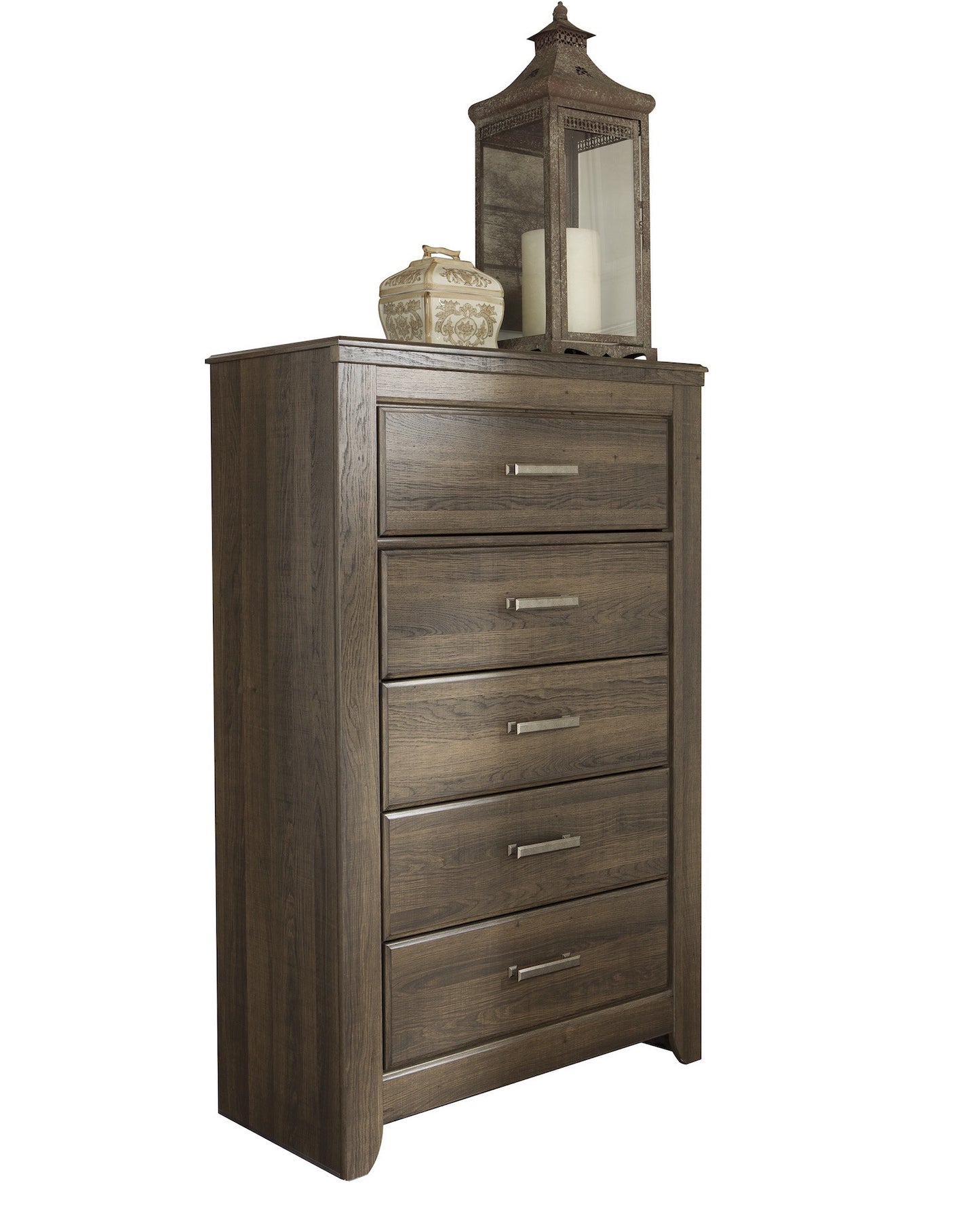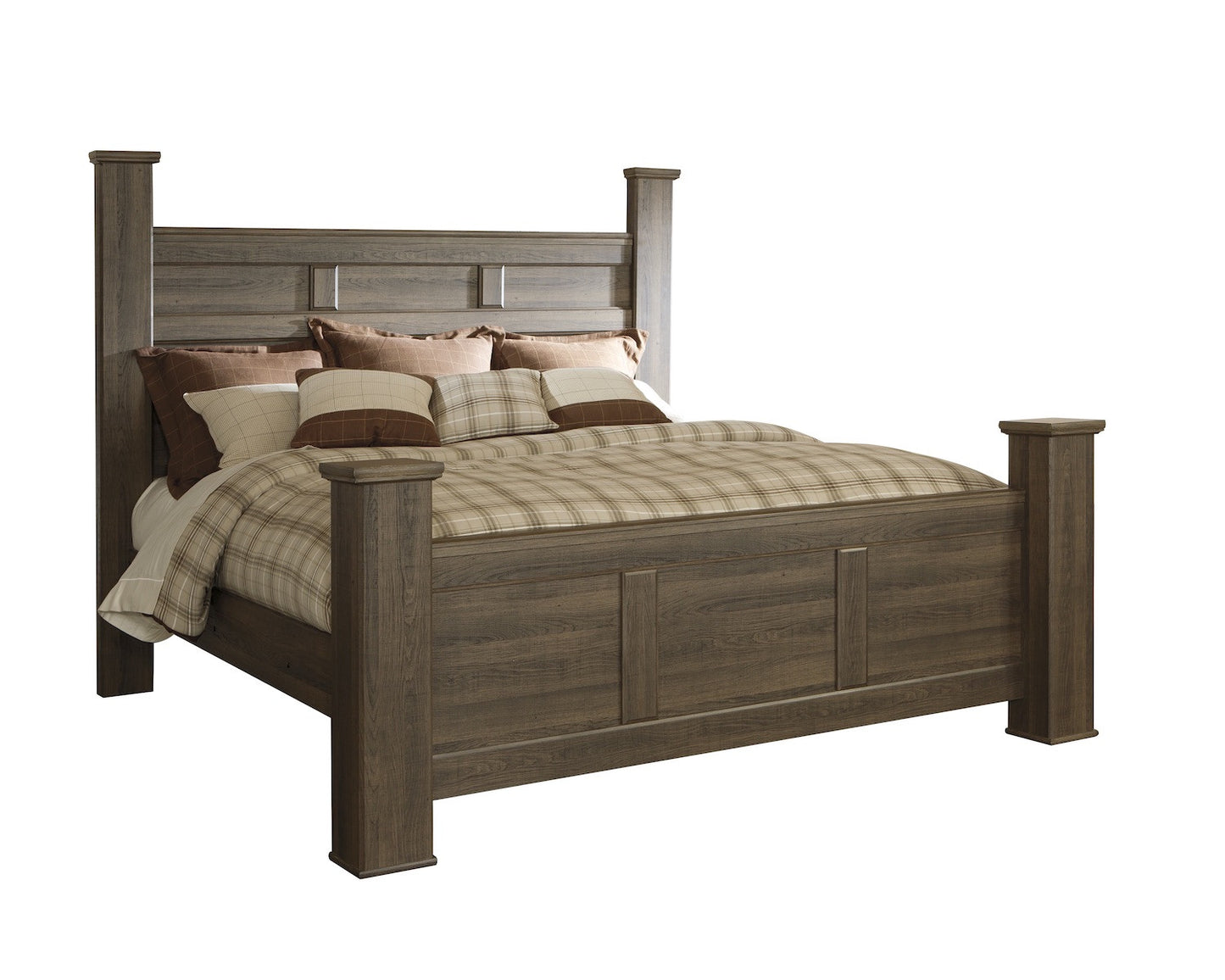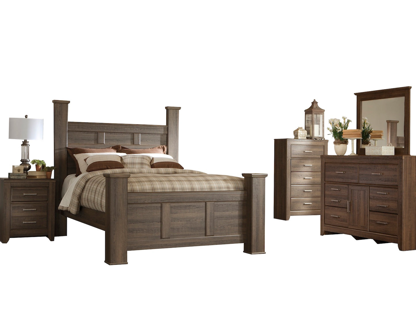 The Ashley Furniture Juararo Replicated rough-sawn oak 5 PC Cal king poster bedroom set with chest has a vintage finish that is reminiscent of a timeworn family heirloom. Warm, rustic and naturally beautiful, it just got that ageless appeal. Sleek hardware in a pewter tone is a snappy finishing touch. The beauty of vintage design come to life with the aged brown rough sawn finish flowing over a replicated oak grain along with the case pilaster detailing and warm pewter color hardware making the Juararo bedroom collection the perfect way to create that cottage getaway within the comfort of your home.