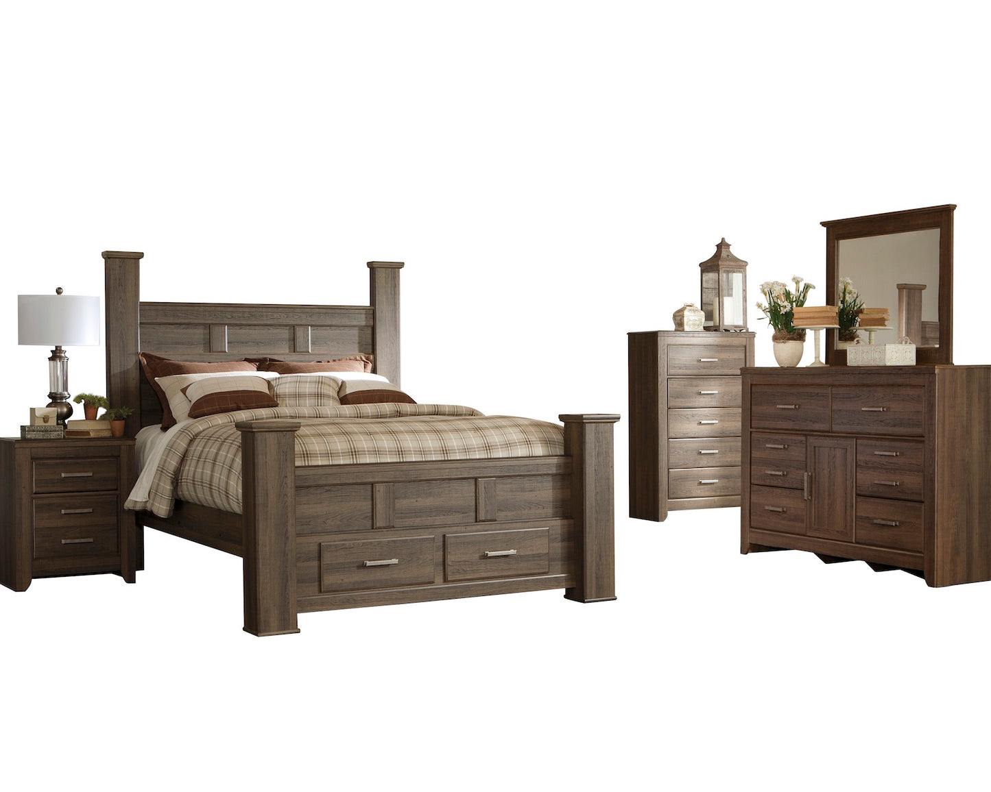 The Ashley Furniture Juararo Replicated rough-sawn oak 5 PC e king storage bedroom Set with chest has a vintage finish that is reminiscent of a timeworn family heirloom. Warm, rustic and naturally beautiful, it just got that ageless appeal. Sleek hardware in a pewter tone is a snappy finishing touch. The beauty of vintage design come to life with the aged brown rough sawn finish flowing over a replicated oak grain along with the case pilaster detailing and warm pewter color hardware making the Juararo bedroom collection the perfect way to create that cottage getaway within the comfort of your home.