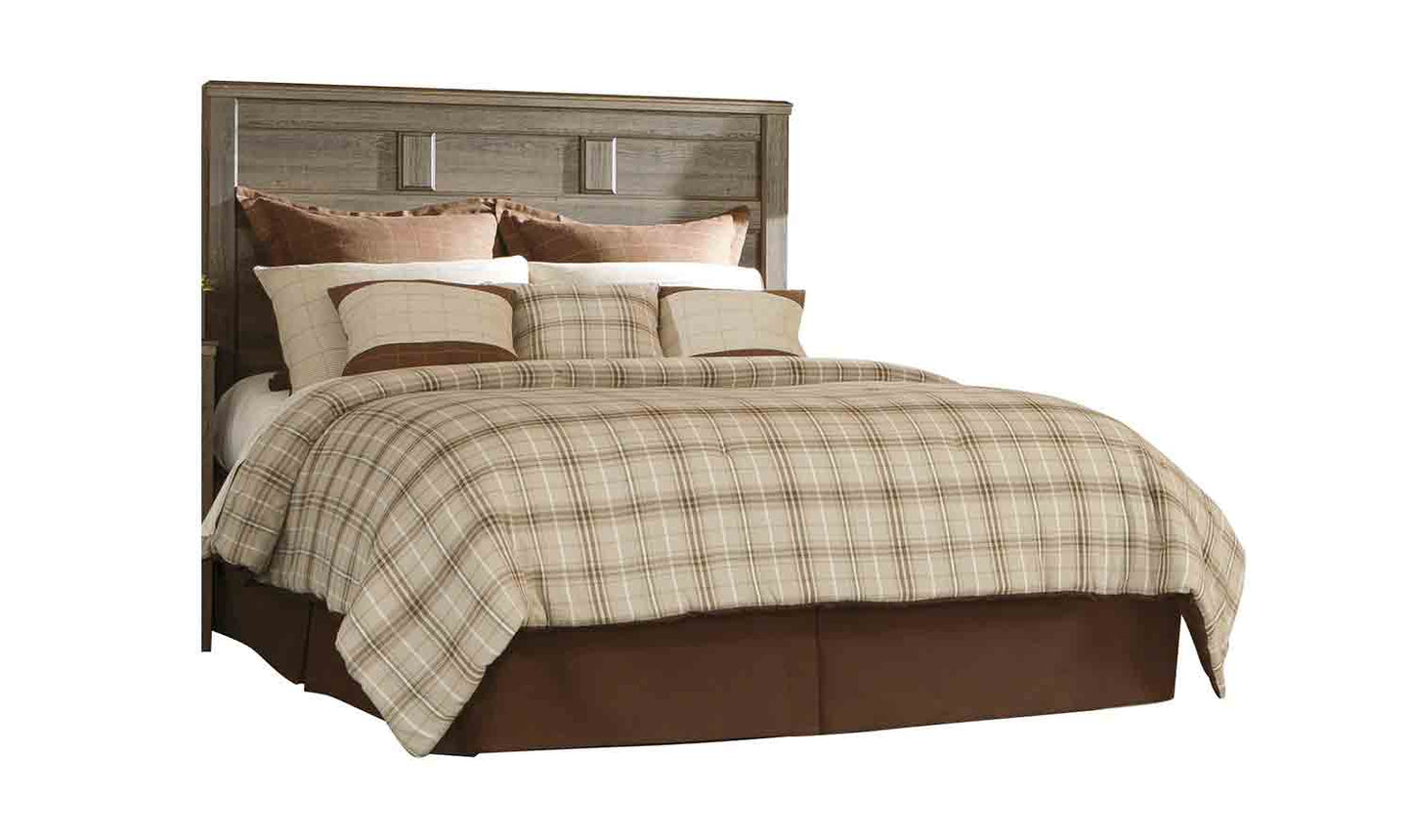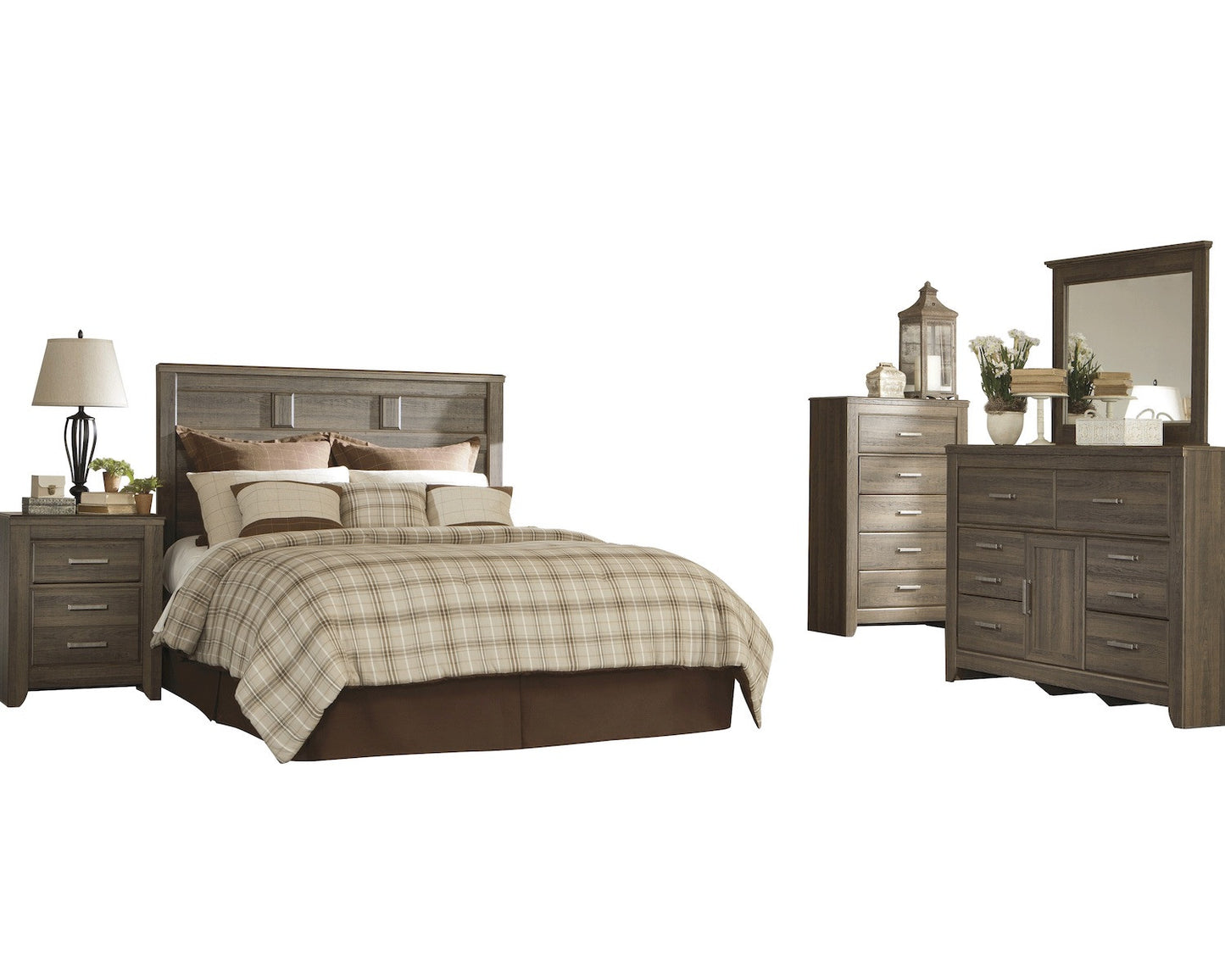The Ashley Furniture Juararo Replicated rough sawn oak 5 PC queen panel headboard bedroom set With Chest has a vintage finish that is reminiscent of a timeworn family heirloom. Warm, rustic and naturally beautiful, it just got that ageless appeal. Sleek hardware in a pewter tone is a snappy finishing touch. The beauty of vintage design come to life with the aged brown rough sawn finish flowing over a replicated oak grain along with the case pilaster detailing and warm pewter color hardware making the Juararo bedroom collection the perfect way to create that cottage getaway within the comfort of your home.