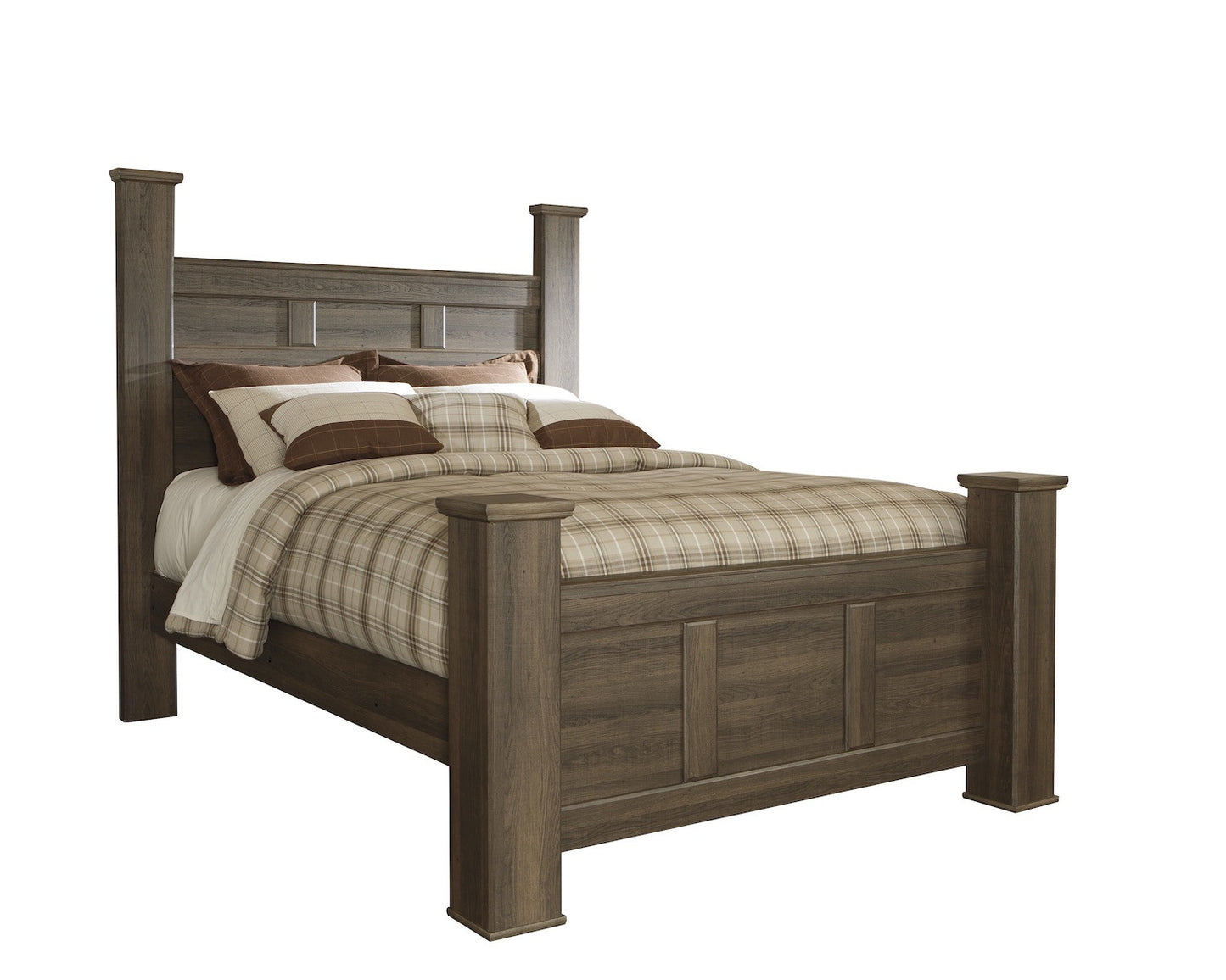 The Ashley Furniture Juararo Replicated rough-sawn oak 5 PC queen poster bedroom set with two nightstand has a vintage finish that is reminiscent of a timeworn family heirloom. Warm, rustic and naturally beautiful, it just got that ageless appeal. Sleek hardware in a pewter tone is a snappy finishing touch. The beauty of vintage design come to life with the aged brown rough sawn finish flowing over a replicated oak grain along with the case pilaster detailing and warm pewter color hardware making the Juararo bedroom collection the perfect way to create that cottage getaway within the comfort of your home.