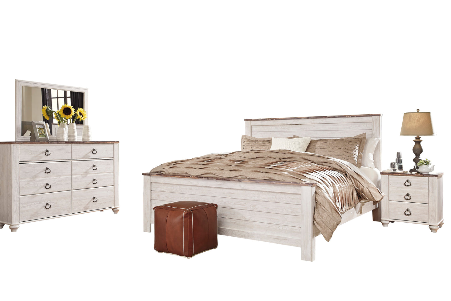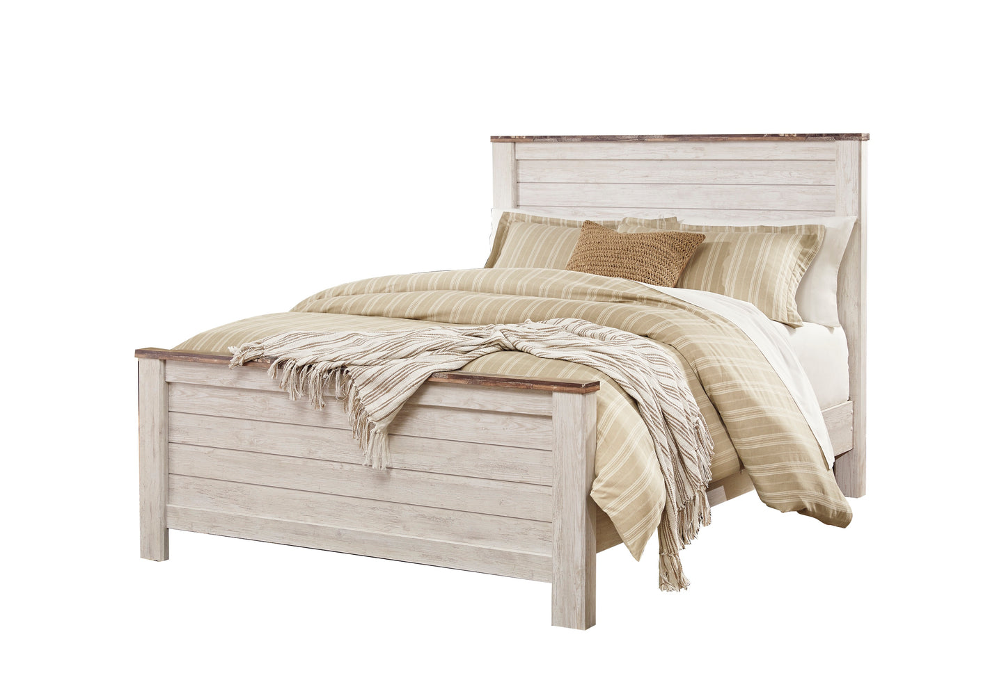 The Ashley Furniture Willowton 4 piece queen panel bedroom set with headboard look ultimate for a beach cottage or shabby chic inspired retreat, the Willowton queen panel headboard carries you away to a dreamy time and place. Driftwood whitewashed finish is wonderfully easy on the eyes. Plank-style detailing incorporates a classically rustic touch, so homey and comforting. Mattress, bed frame and foundation/box spring sold separately.
