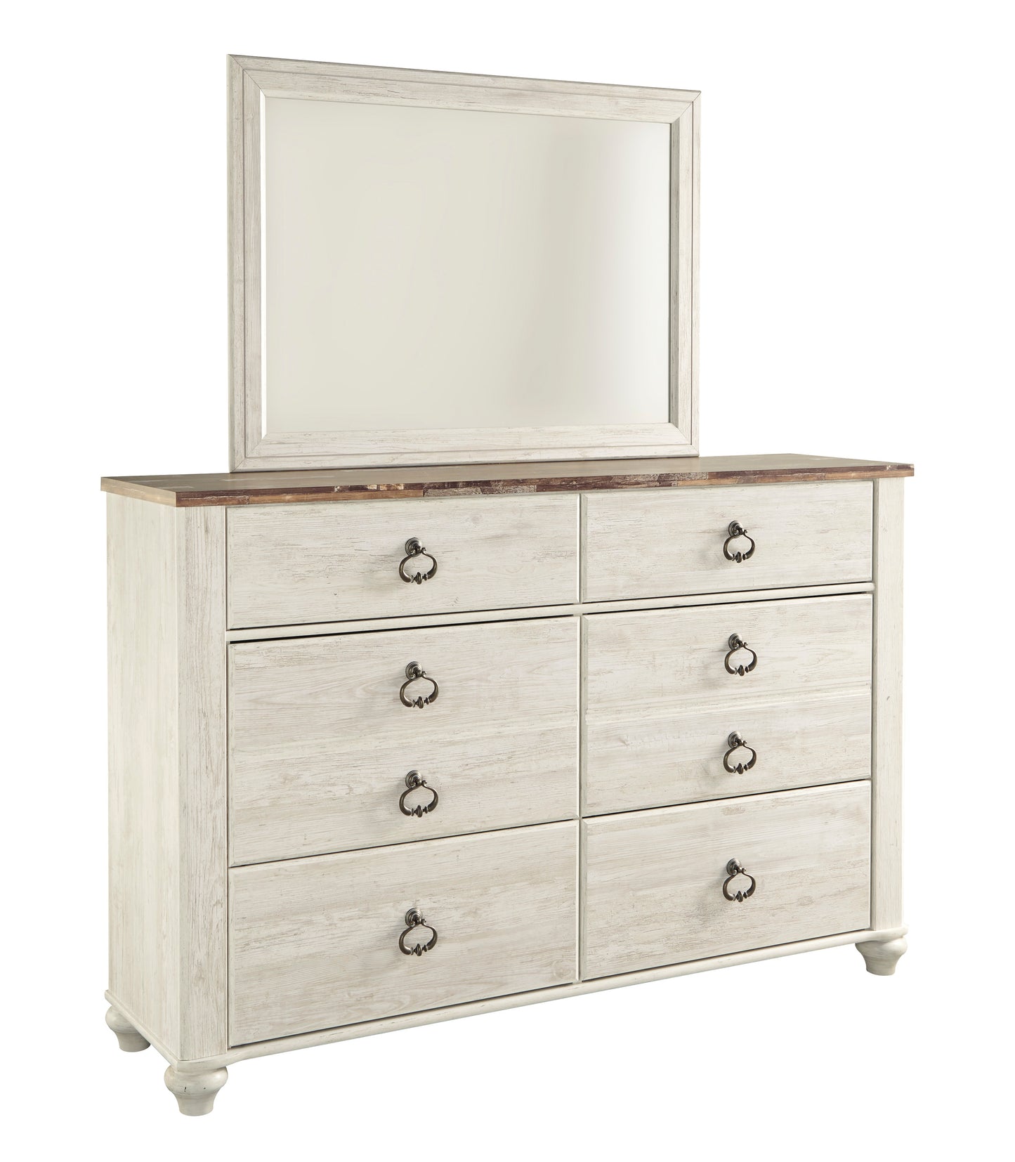 FeaturesSeries Features: Two-tone finish in white wash replicated worn through paint with authentic touch and a replicated wood grained block pattern with authentic touch. Large scaled shapely bedroom collection features bun feet. Ring pull hardware in an antique brass color, accented with white paint hang up. Dressing chest with a slider door reveals open storage with two adjustable shelves and four drawers. Side roller glides for smooth operating drawers. Twin (53,63) and full (87,72) headboards can attach to a bolt-on metal bed B100-21. Queen (57,77) and king (58,78) headboards can attach to a bolt-on metal bed frame B100-31 or B100-66 respectively. Slim USB charger located on the back of the night stand tops.