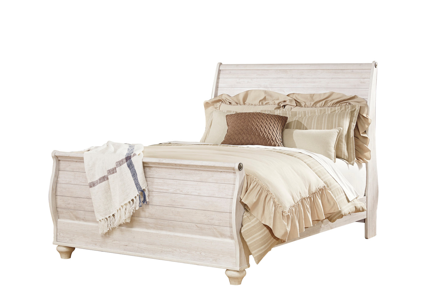 The Ashley Furniture Willowton 4 piece queen sleigh bedroom set look ultimate for a beach cottage or shabby chic inspired retreat, the Willowton queen sleigh headboard carries you away to a dreamy time and place. Driftwood whitewashed finish is wonderfully easy on the eyes. Plank-style detailing incorporates a classically rustic touch, so homey and comforting. Mattress, bed frame and foundation/box spring sold separately.