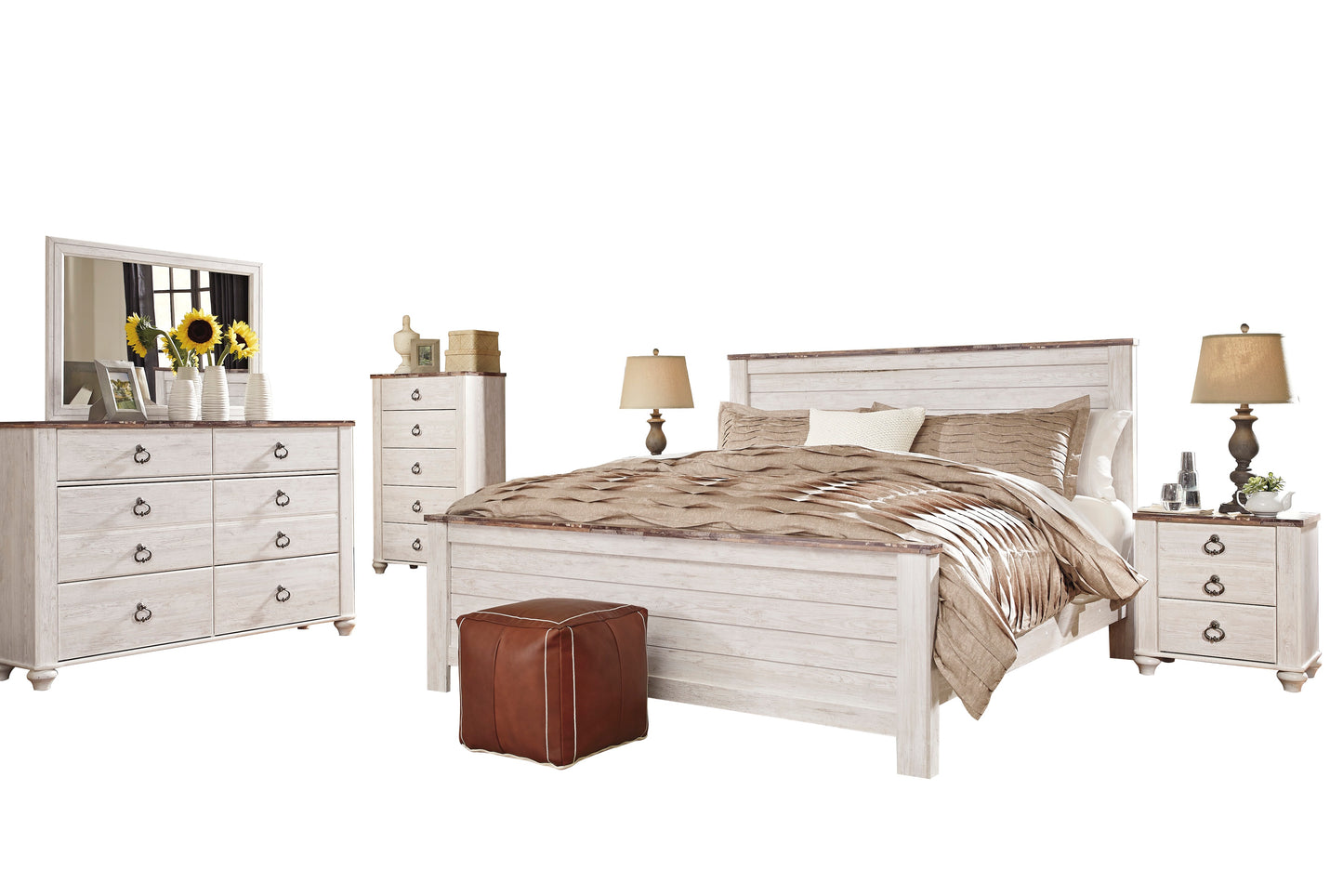 The Ashley Furniture Willowton 6 piece queen panel bedroom set with headboard look ultimate for a beach cottage or shabby chic inspired retreat, the Willowton queen panel headboard carries you away to a dreamy time and place. Driftwood whitewashed finish is wonderfully easy on the eyes. Plank-style detailing incorporates a classically rustic touch, so homey and comforting. Mattress, bed frame and foundation/box spring sold separately.
