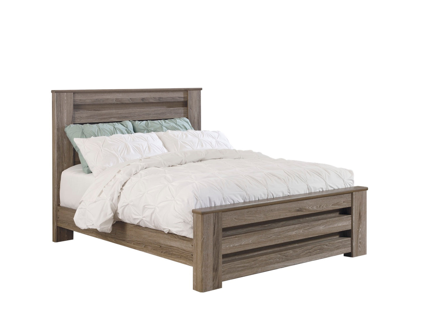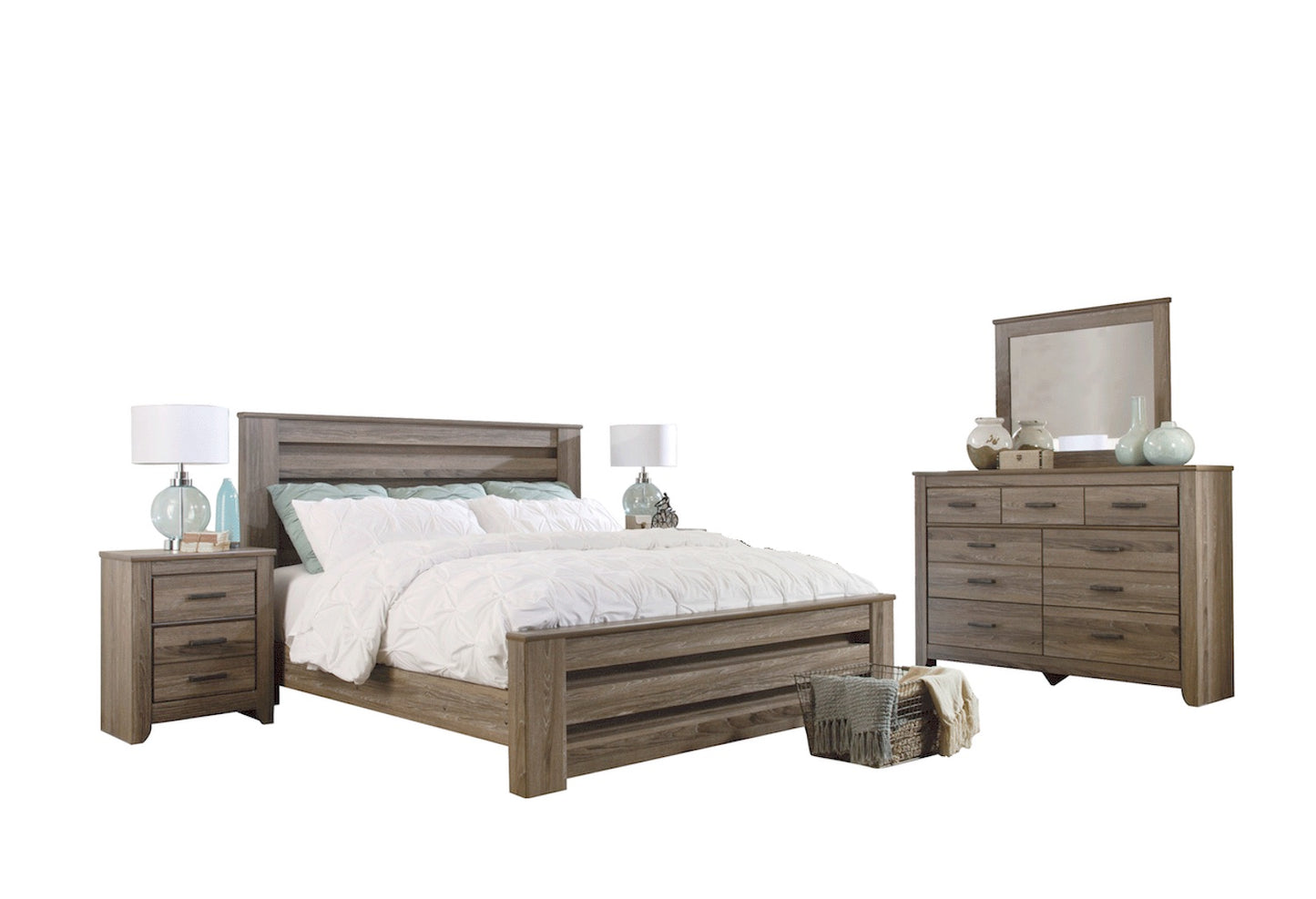 The Ashley Furniture Zelen 5 piece e king panel bedroom set with two nightstand crisp, contemporary lines and a cool driftwood warm gray finish make the seen e king panel headboard a dream come true in the bedroom. Dresser & mirror exudes an air of opulence priced to entice. Stacked moldings infuse a thick planked look with added dimension. Nightstand appreciate the appeal of inspired style.