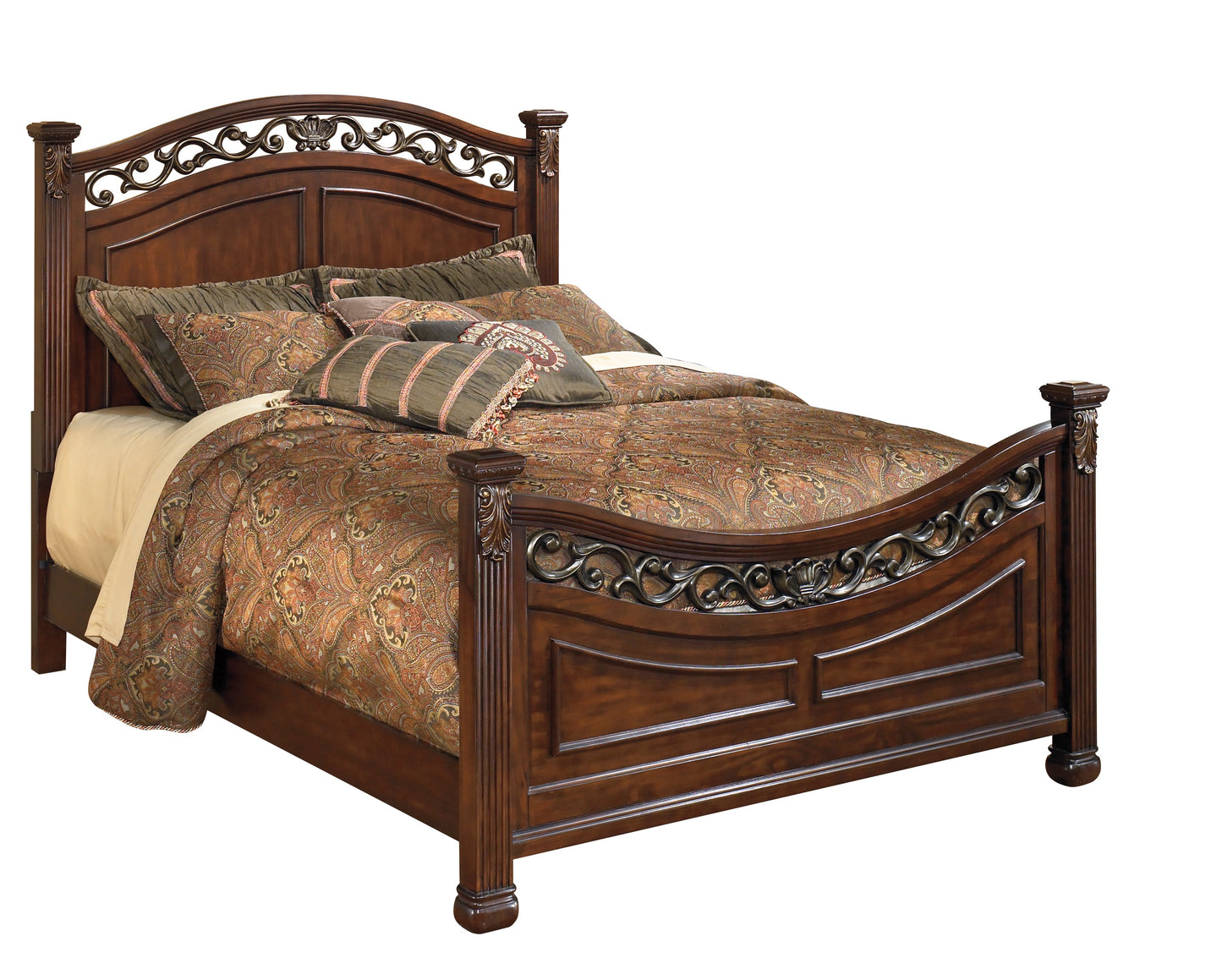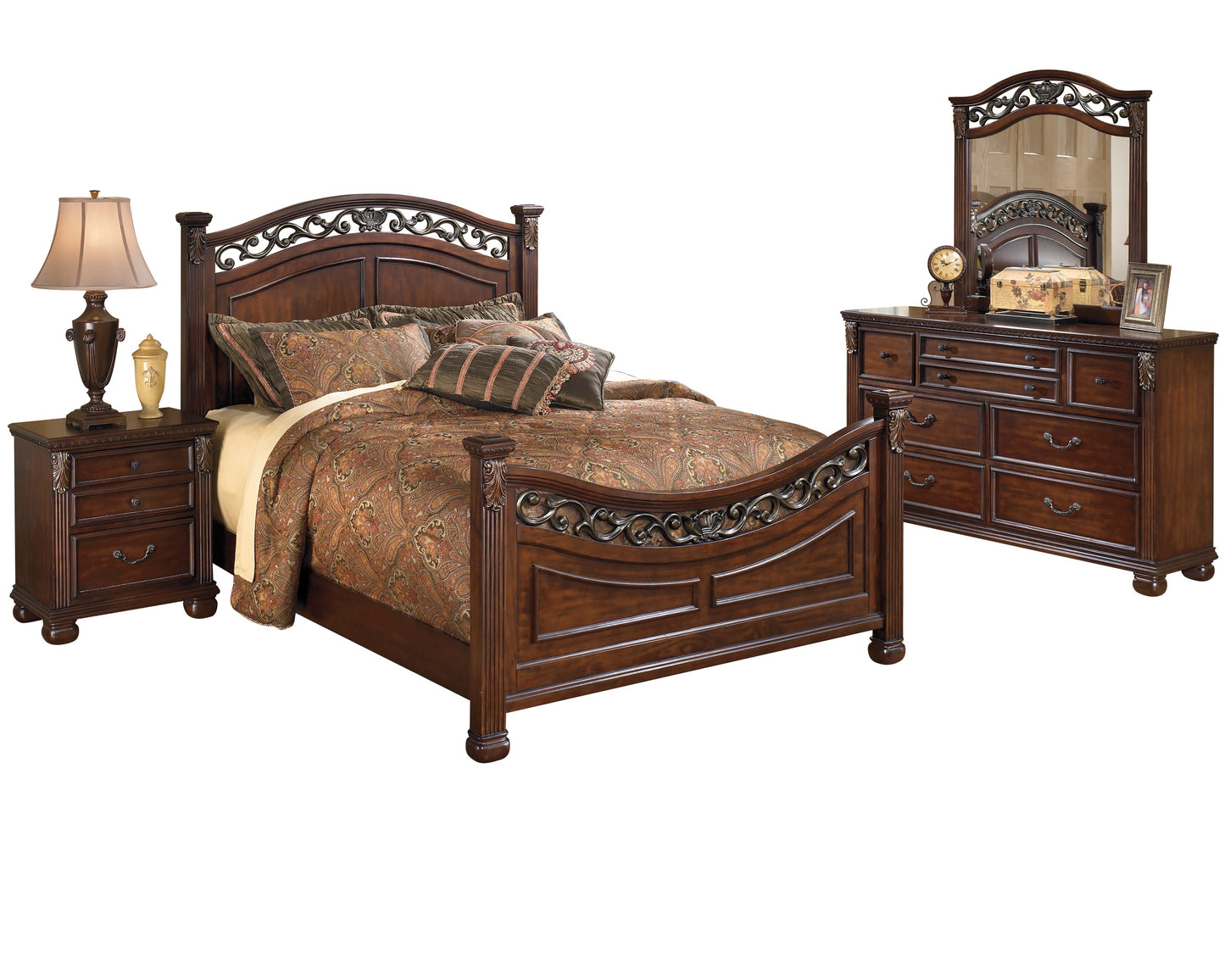 The Ashley Leahlyn 4 PC Bedroom Set E King Panel Bed Dresser Mirror One Nightstand in Warm Brown. Want that instant heirloom effect? The Leahlyn E King Panel Bed will weather a lifetime of fashion trends and maintain its classic character. It's reproduced with many of the design elements you"D expect of a much more expensive piece, including pilaster and acanthus accents, foliage filigree and framed bed panels. Why wait for your inheritance when you can have it now?
