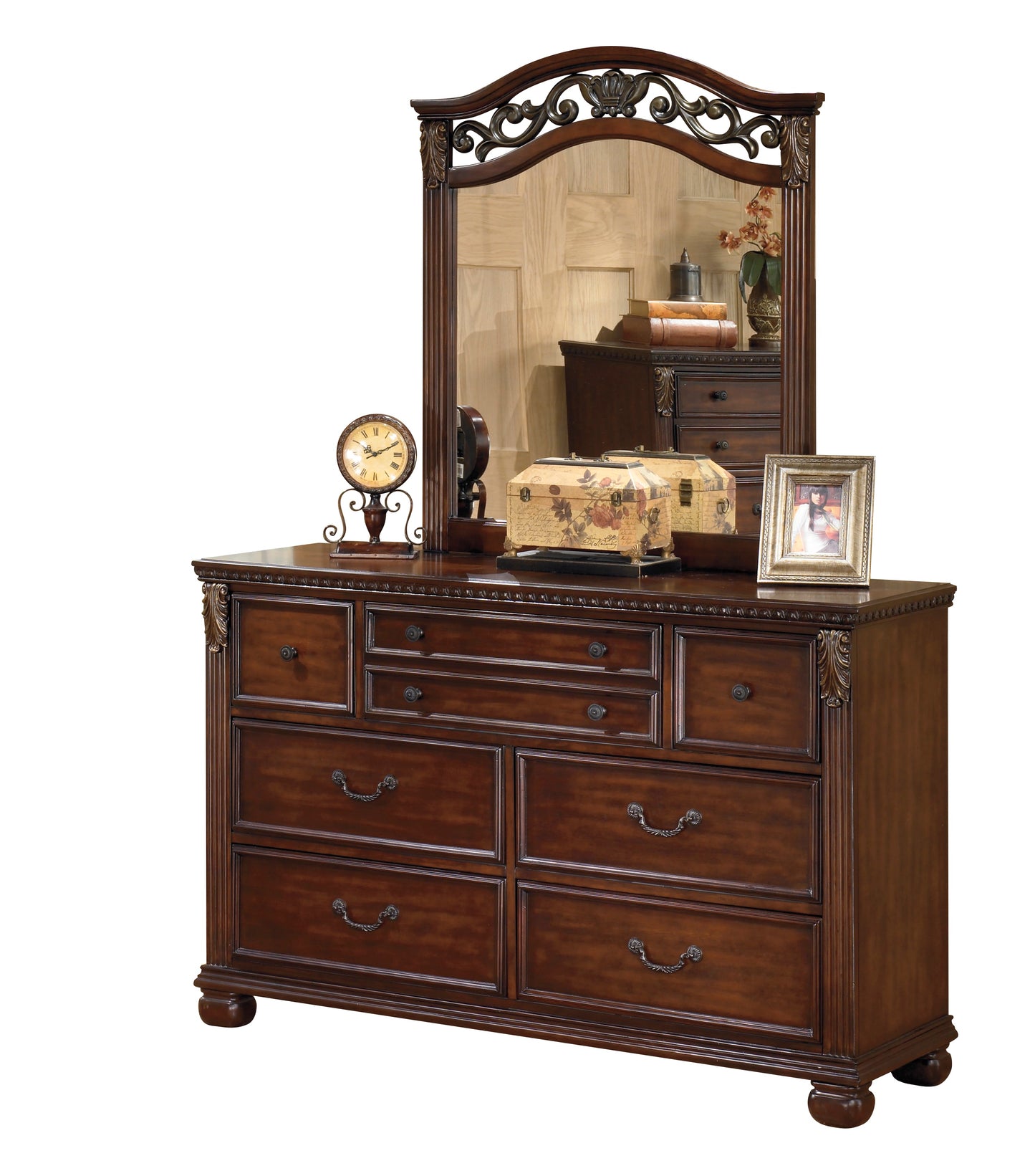 FeaturesMade with select birch veneer and hardwood solids. Fluted pilasters have leaf form corbels. Drawers and bed panels have bead frames. Drawers have ornate bail or knobs in an antique brass color finish. Drawer boxes are French/English dovetail in a natural color and use a center metal glide system. Mirror and bed feature a cast foliage filigree in a warm metallic color finish.