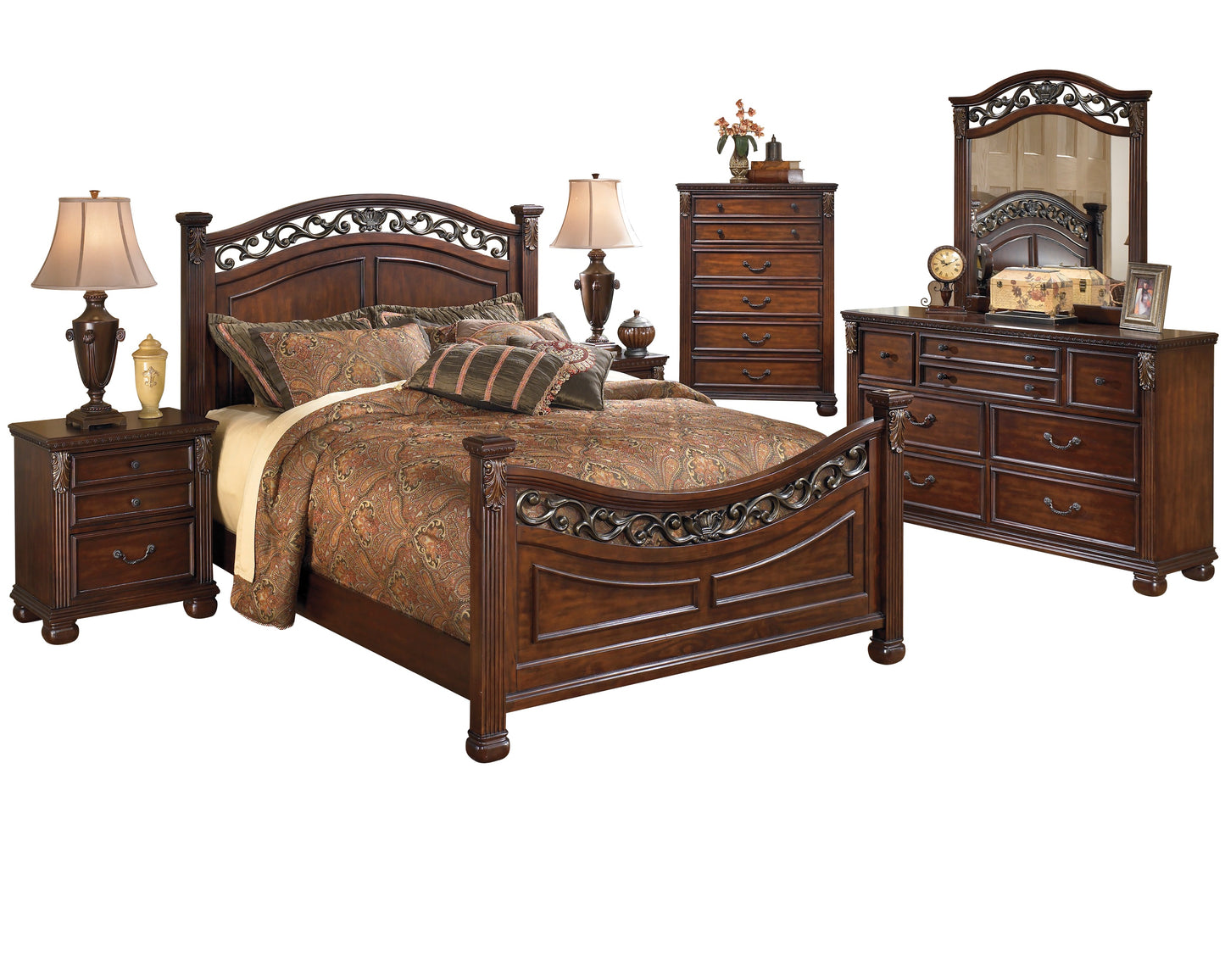 The Ashley Leahlyn 6 PC Bedroom Set Cal King Panel Bed Dresser Mirror Two Nightstand Chest in Warm Brown. Want that instant heirloom effect? The Leahlyn Cal King Panel Bed will weather a lifetime of fashion trends and maintain its classic character. It's reproduced with many of the design elements you"D expect of a much more expensive piece, including pilaster and acanthus accents, foliage filigree and framed bed panels. Why wait for your inheritance when you can have it now?