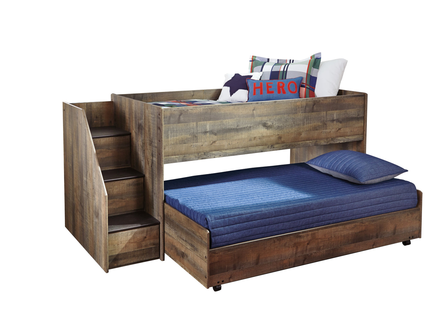 The Ashley Trinell Twin Loft Bed in Brown. Whether she loves horses or he's a cowboy at heart, Trinell twin loft bed matches their authenticity. Rustic finish, plank-style details and nail head trim pay homage to reclaimed barn wood, making for a chic look loaded with charm. Mattresses available, sold separately.