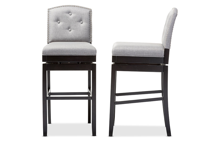 Please note due to current situation, product might not be available. Please do call to check for availability. All stock will be verified before order is processed.Description Contemporary 2 Button Tufted Swivel Bar Stools in Grey Fabric