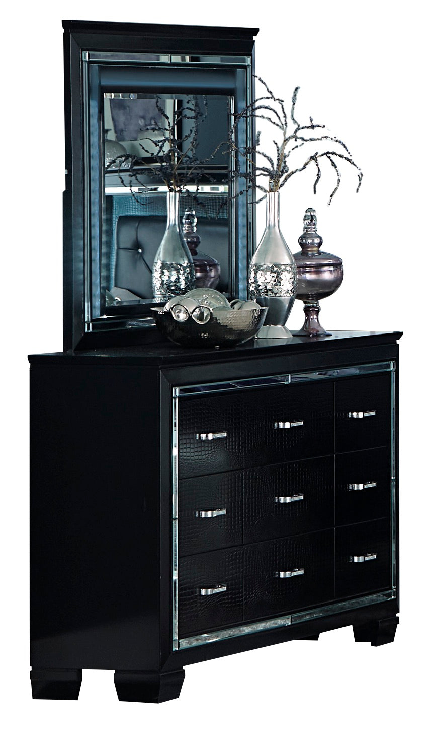 The Almada Dresser Mirror with LED Lighting in Black Alligator Embossed. reigns in the design of the Allura Collection. Framing each piece is a decorative beveled mirror accent that enhances the illumination from the touch-engaged LED back-light of the headboard and mirror, as well as the under-light of the night stand. Alligator embossing and high polished crystal-enhanced hardware boldly accent the available silver or black finish of the collection.