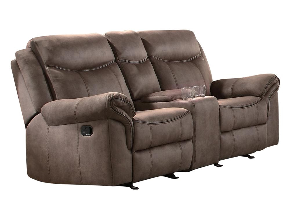 The Homelegance Aram Double Glider Reclining Love Seat with Center Console and Receptacles in Airehyde Leather - Brown. With amply appointed offerings that create not only a comfortable seating experience but a functional one as well, the Aram Collection will be a welcome addition to your home. The seating group is offered in a brown fabric or dark brown AireHyde for comfort and style that will blend effortlessly with your transitional decorative preference. Manual motion mechanisms operate with the pull of a side-mounted tab, that once engaged, take you from seated to reclined in an easy motion. Each piece in the collection has an individual function allowing for convenience and comfort. The sofa features dual reclining ends and a drop down center seat back with cup-holders, electric receptacles, USB port and tabletop space, the dual glider reclining ends of the love seat flank a center mounted console with storage, electric receptacles and cup-holders, and the reclining chair features a glider mechanism that allows for easy back and forth motion.