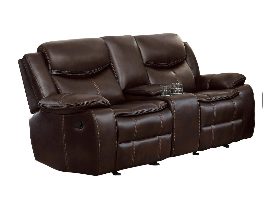 The Homelegance Bastrop Double Glider Reclining Love Seat with Center Console in Leather - Dark Brown. Comfort is the name of the game in the Bastrop Collection. The collection is offered in several configurations � traditional sofa, love seat and chair, and sectional � for versatile placement in your living room maximum relaxation potential in your downtime. The two optional coverings � black or brown leather gel match � feature contrast welting for definition of profile and modern accenting. Manually engaged motion mechanisms allow for quick transition from seated to prone with the quick pull of a tab. Each piece in the collection has an individual function allowing for convenience and comfort. The sofa features dual reclining ends, the dual glider reclining ends of the love seat flank a center mounted console with storage and cup-holders, and the chair features a glider mechanism that allows for easy back and forth motion. The sectional configuration features a left side love seat with reclining end and the right side double reclining love seat with center console unit featuring cup holders and storage.