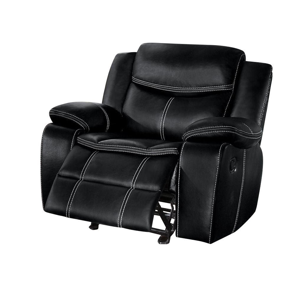 The Homelegance Bastrop Glider Reclining Chair in Leather - Black. Comfort is the name of the game in the Bastrop Collection. The collection is offered in several configurations � traditional sofa, love seat and chair, and sectional � for versatile placement in your living room maximum relaxation potential in your downtime. The two optional coverings � black or brown leather gel match � feature contrast welting for definition of profile and modern accenting. Manually engaged motion mechanisms allow for quick transition from seated to prone with the quick pull of a tab. Each piece in the collection has an individual function allowing for convenience and comfort. The sofa features dual reclining ends, the dual glider reclining ends of the love seat flank a center mounted console with storage and cup-holders, and the chair features a glider mechanism that allows for easy back and forth motion. The sectional configuration features a left side love seat with reclining end and the right side double reclining love seat with center console unit featuring cup holders and storage.