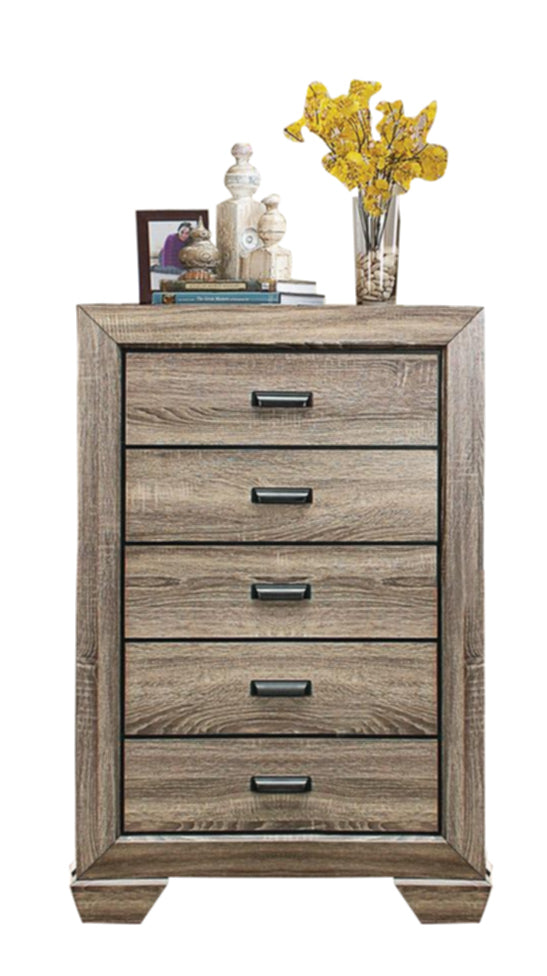 The Ballar Rustic 5PC Bedroom Set E King Bed, Dresser, Mirror, Nightstand, Chest in Natural Wood. Blending the elements of contemporary design and rustic aesthetic, the Beechnut Collection is a unique addition to your master, youth or guest bedroom. Dark under-paneling serves to highlight the light finish of the embossed faux-wood veneer of the raised panels on the bed and case goods. Contrasting cup hardware punctuates each drawer front.