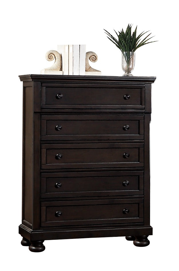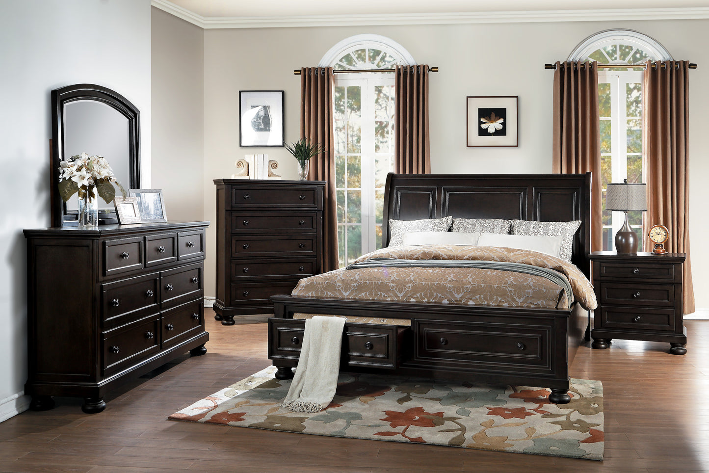 The Belize Traditional Modern 6PC Bedroom Set Queen Storage Platform Bed, Dresser, Mirror, 2 Nightstand, Chest in Brown Grey. Casual transitional styling lends versatility to the placement of the Begonia Collection in a number of bedroom settings. The gray finish lends distinctly to the execution of different looks from traditional to country casual, with knob hardware punctuating the look of each framed drawer front. Hidden drawers in the nightstand and dresser provide discrete storage for your valuables, while the storage drawers of the footboard provide a more visible means of additional storage capability. Bun feet support the case goods and a sleigh headboard finish off the transitional design of the collection.