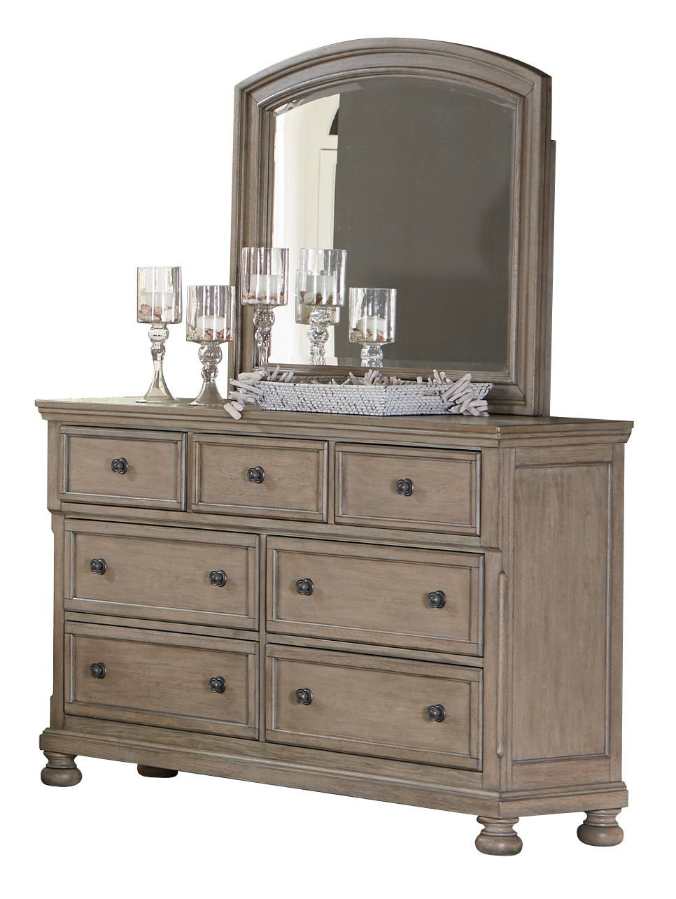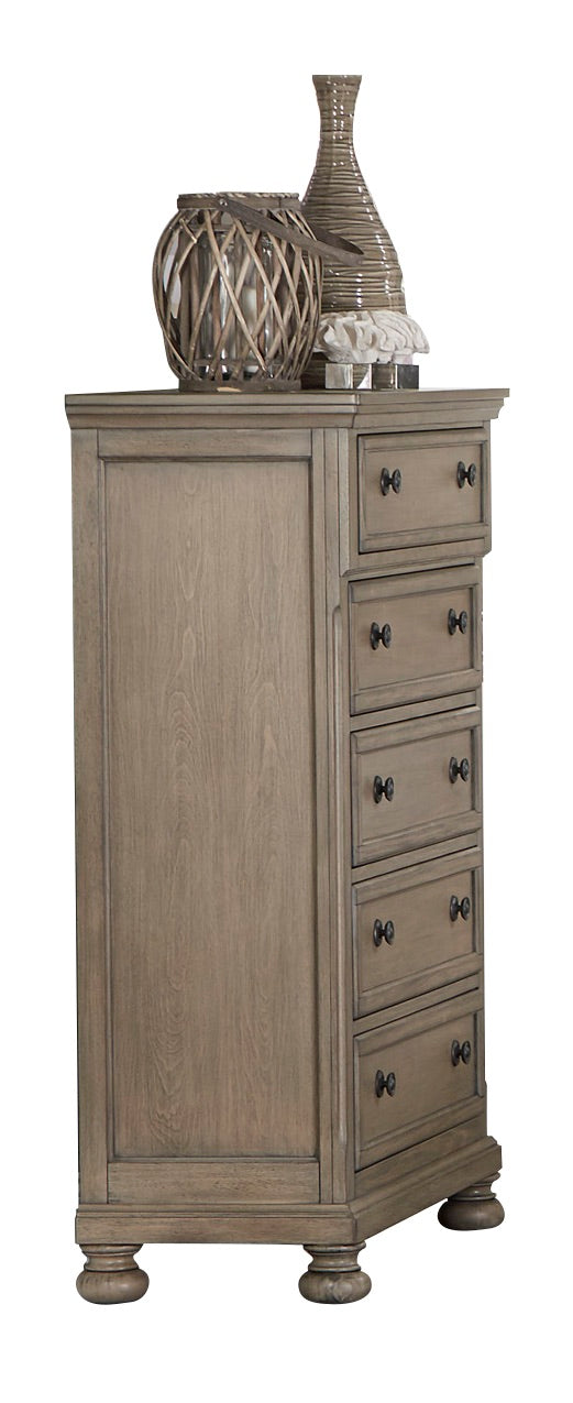 The Broville Rustic 5PC Bedroom Set Cal King Sleigh Storage Bed, Dresser, Mirror, Nightstand, Chest in Weathered Wood. An updated classic addition to your transitional bedroom will be the Bethel Collection. Traditional accents, such as, turned bun feet that support each piece, and a gray, lightly wire-brushed finish on birch veneer and selected hardwoods, blend with framing and lines that compliment your personal style. Hidden drawer storages in the night stand and dresser are a clever way to hide your valuables.
