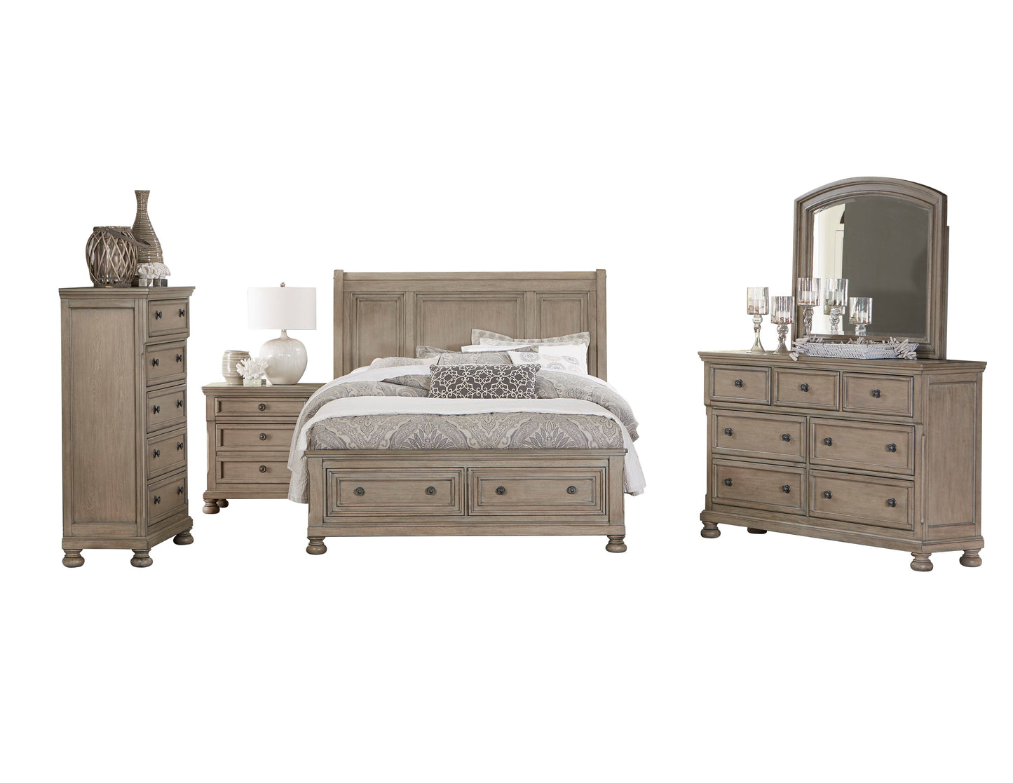 The Broville Rustic 5PC Bedroom Set E King Sleigh Storage Bed, Dresser, Mirror, Nightstand, Chest in Weathered Wood. An updated classic addition to your transitional bedroom will be the Bethel Collection. Traditional accents, such as, turned bun feet that support each piece, and a gray, lightly wire-brushed finish on birch veneer and selected hardwoods, blend with framing and lines that compliment your personal style. Hidden drawer storages in the night stand and dresser are a clever way to hide your valuables.