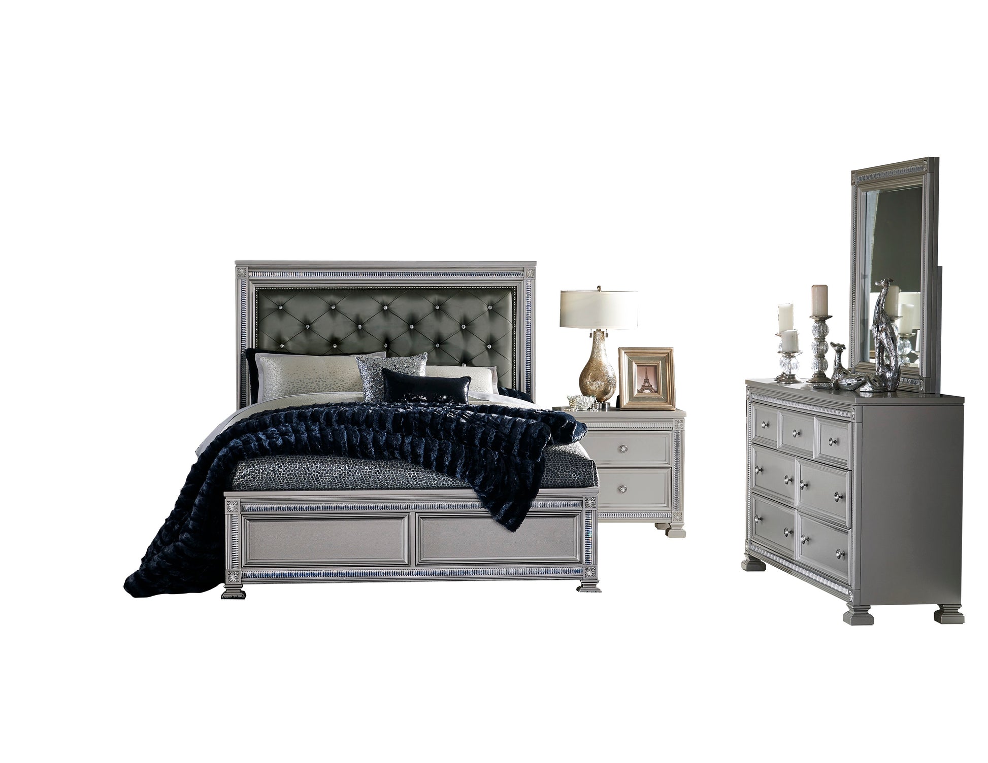The Homelegance Bevelle 4PC Bedroom Set E King Bed Dresser Mirror One Nightstand in Metallic Grey. Modern glamour is exemplified in the design of the Bevelle Collection. Acrylic crystals frame each piece in the collection, reflecting the light to create eye-catching drama. The silver finish serves as the perfect complement to the high-polish decorative knob hardware and medallion accents. A stylish mirrored vanity, with coordinating stool, provides additional function to the collection. Providing contrast to finish is the dark gray bi-cast vinyl, button-tufted headboard panel. A coordinating dining room is also available.