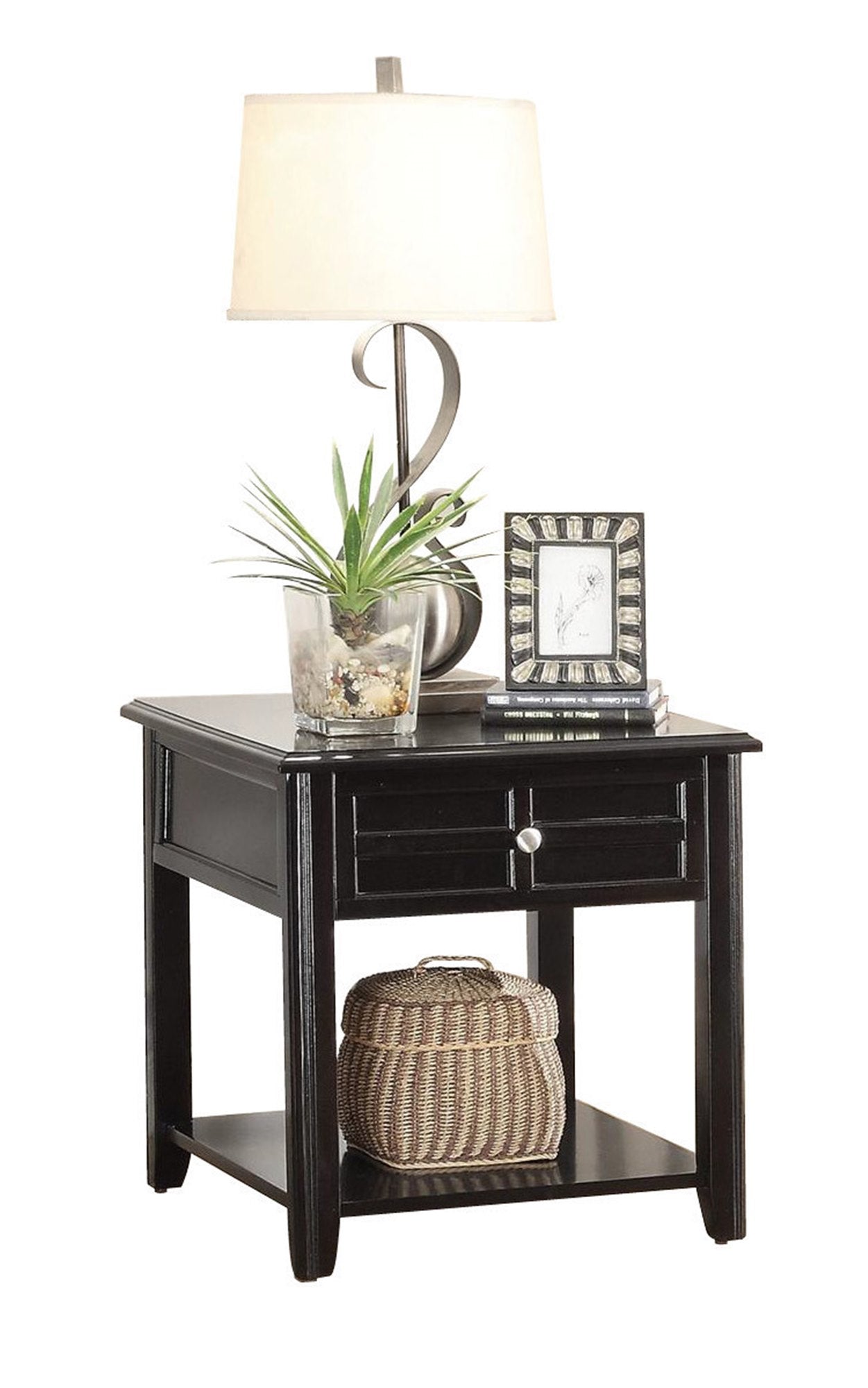 The Homelegance Carrier End Table with Functional Drawer in Dark Espresso. Designed for placement in a number of living room settings, the Homelegance Carrier Collection is a functional and stylish addition to your home. The cocktail�s tabletop lifts to extend to your seated position and is supported by casters for ease of movement, the end table and chair side table feature a functional drawer. All three pieces in the collection feature lower display shelving. An dark espresso finish further lends to the look of this versatile occasional grouping.