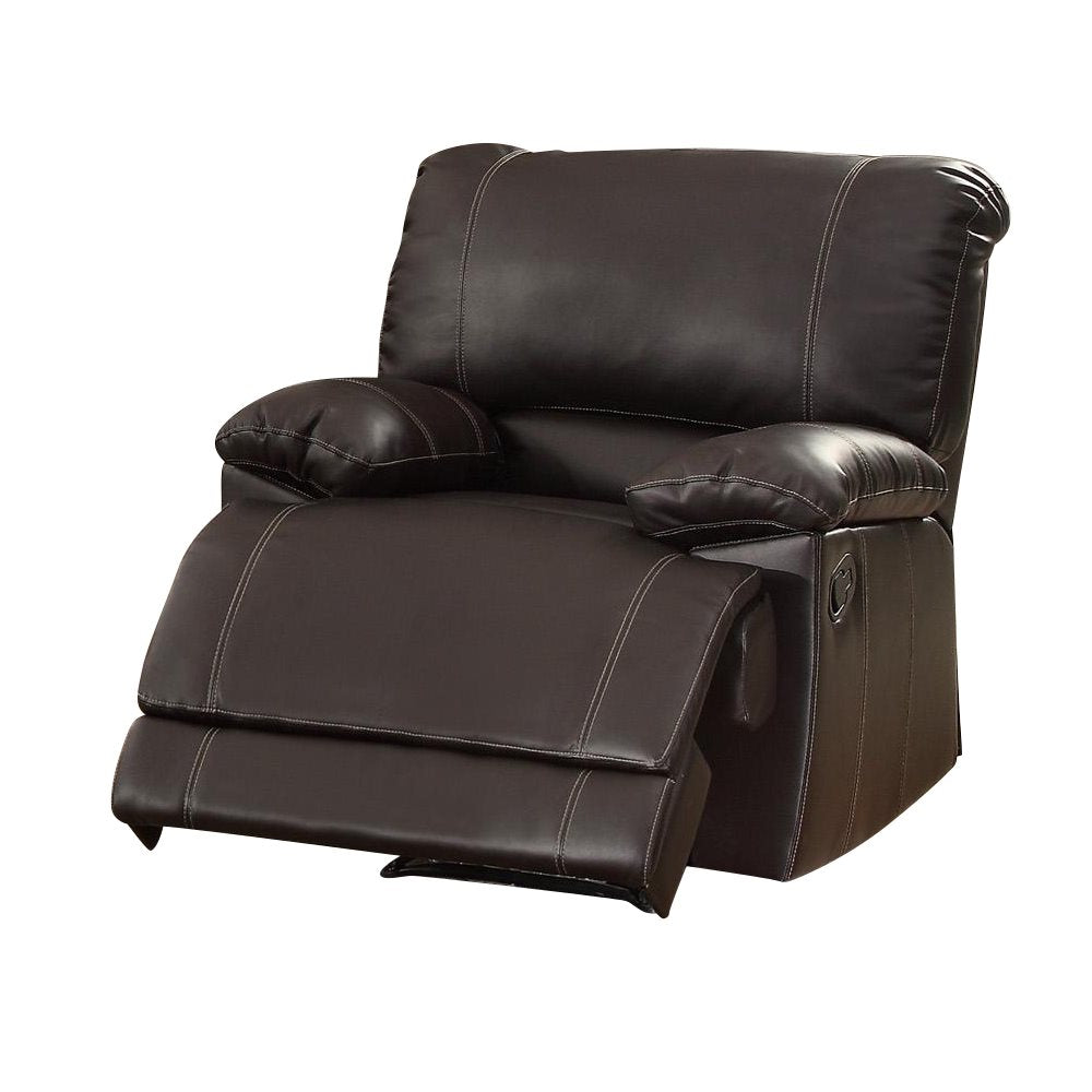 The Homelegance Cassville Reclining Chair in Dark Brown Leather. Uniquely appointed for ultimate relaxation, the Homelegance Cassville Collection will provide your living room with a comfortable place to spend your downtime. Dark brown bi-cast vinyl covers the plush seating of this motion seating group. The sofa features a unique drop down back center console and dual reclining ends. The accompanying chair completes the arrangement with a reclining mechanism.