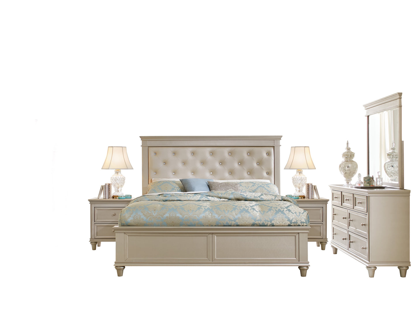The Caen Modern Glam 5PC Bedroom Set Queen Bed, Dresser, Mirror, 2 Nightstand in Pearl. The look of traditional design is updated for the modern traditional home in the Celandine Collection. Crystal tufting immediately draws the eyes to the pearlized finish of the bi-cast vinyl headboard insert, while high polished knob hardware stands out from the silver finish of the collection. With each of the aforementioned elements, subtle glamour will be achieved in the design of your elegant bedroom.