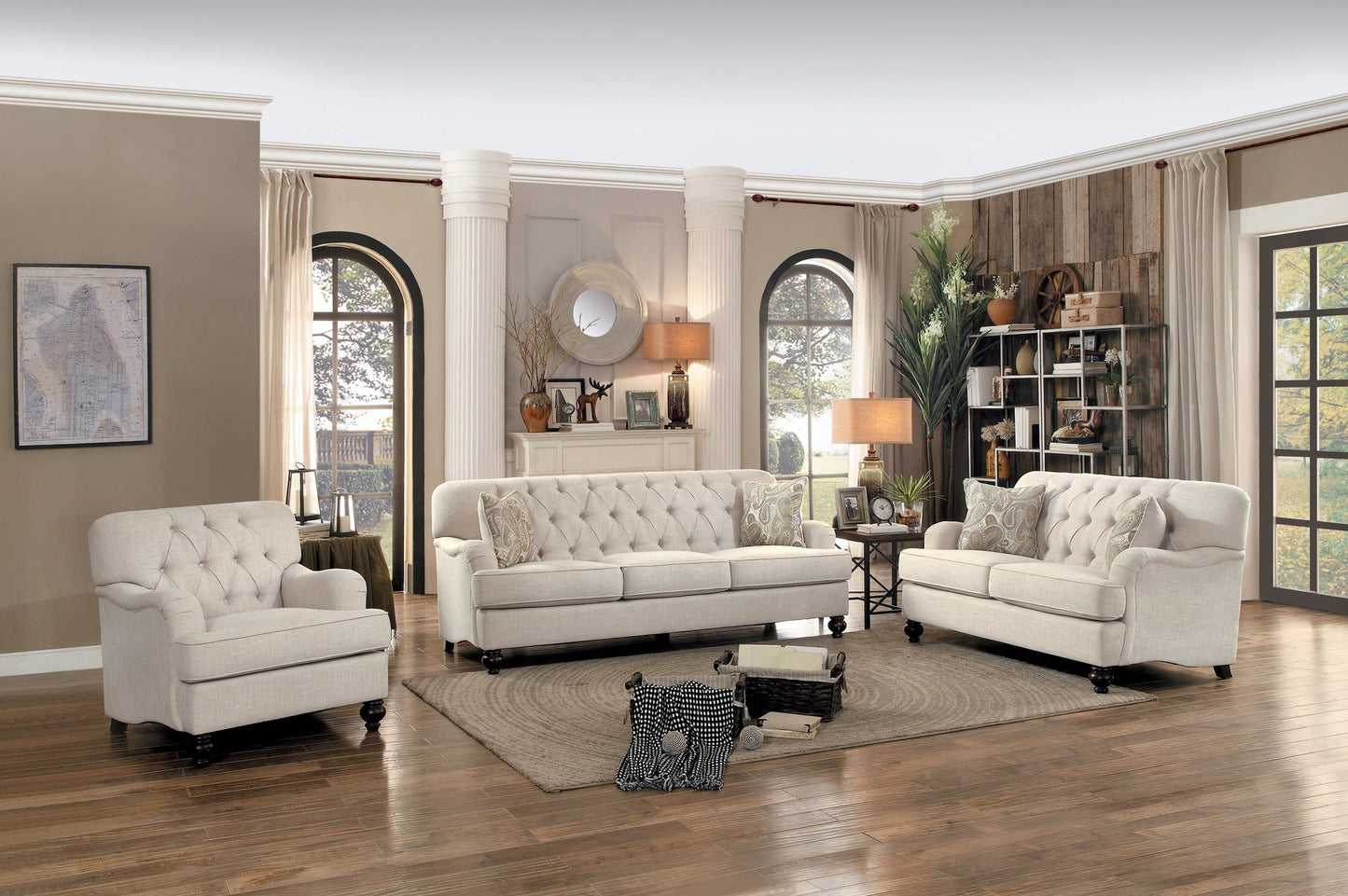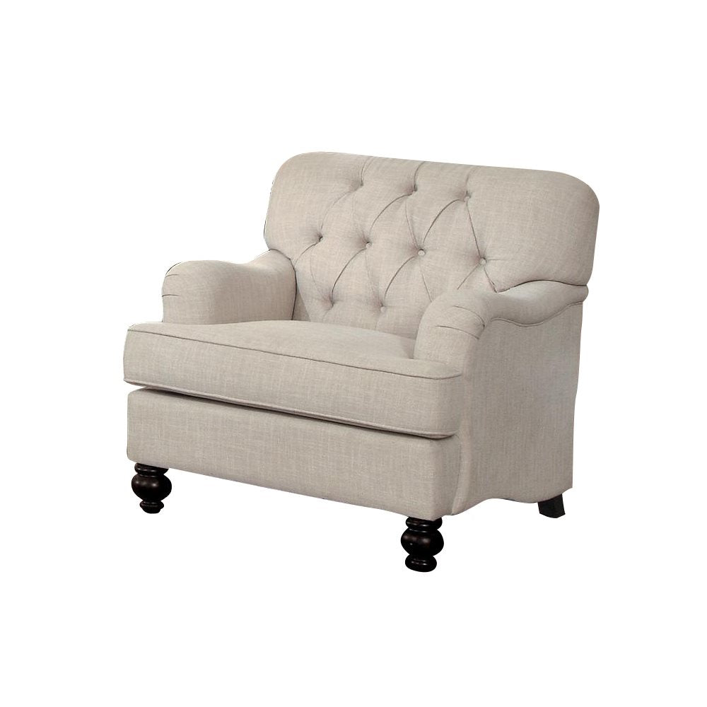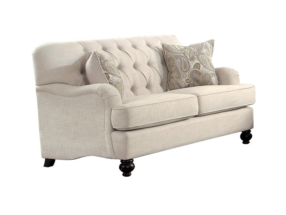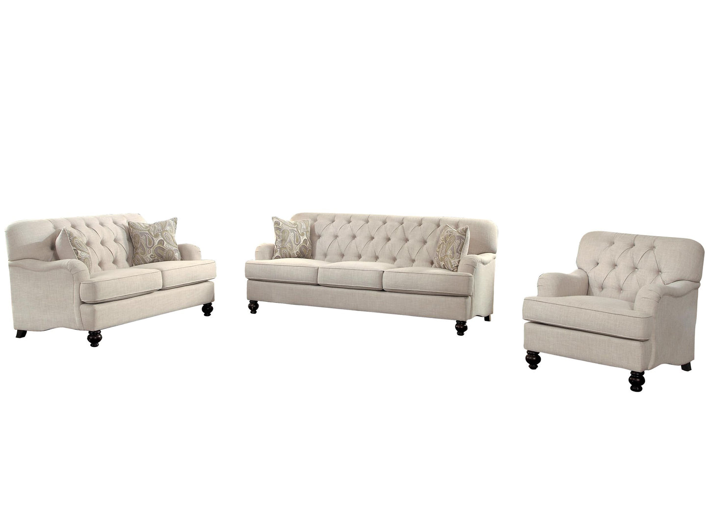 The Homelegance Clemencia Park 3PC Sofa, Love Seat & Chair in Natural Fabric. Modern traditional design is executed with perfection in the Homelegance Clemencia Park Collection. Contoured low-profile English roll arms paired with button tufting and contrast pillows create a warm and inviting option for your living room. Natural colored fabric covers, complete the traditional look of the collection.