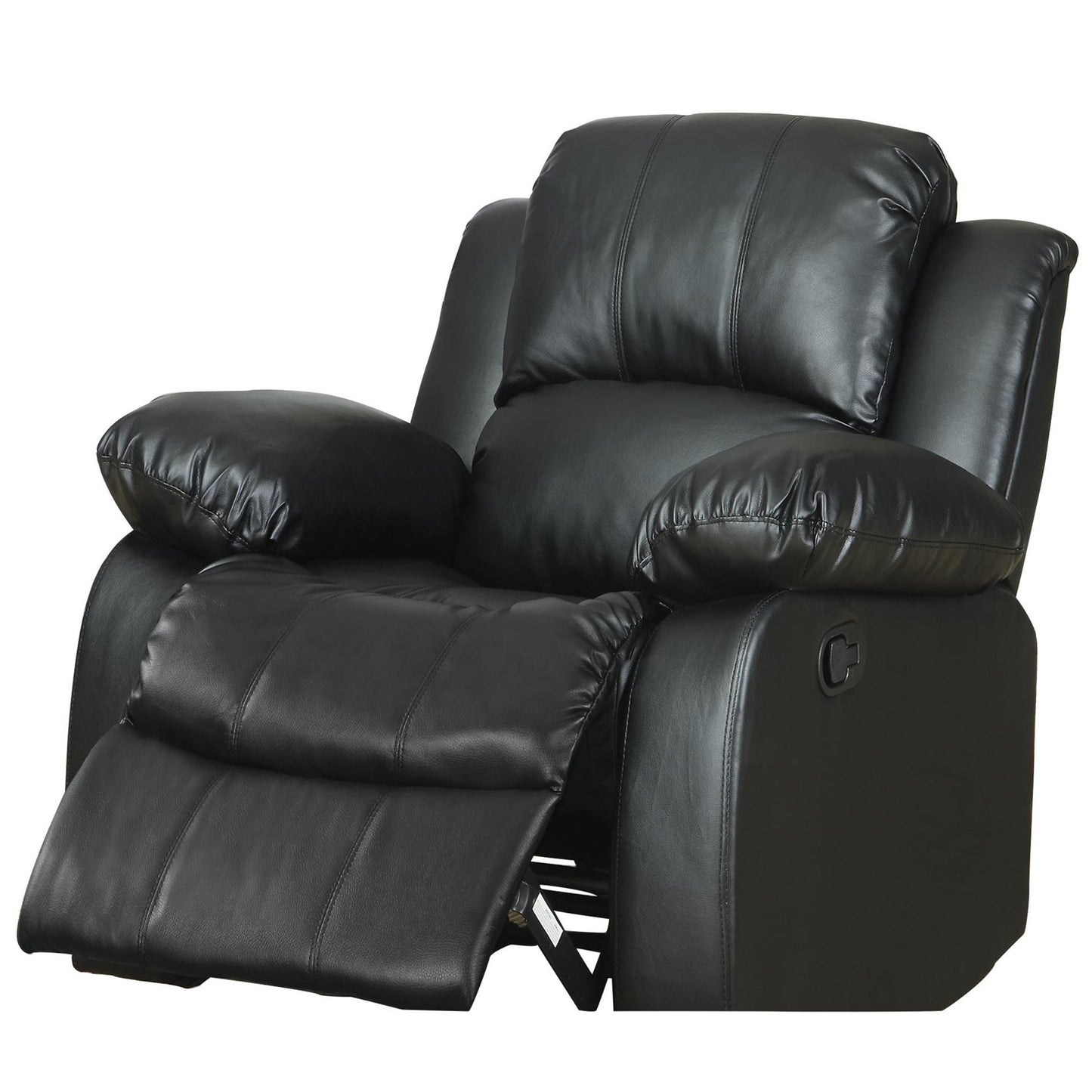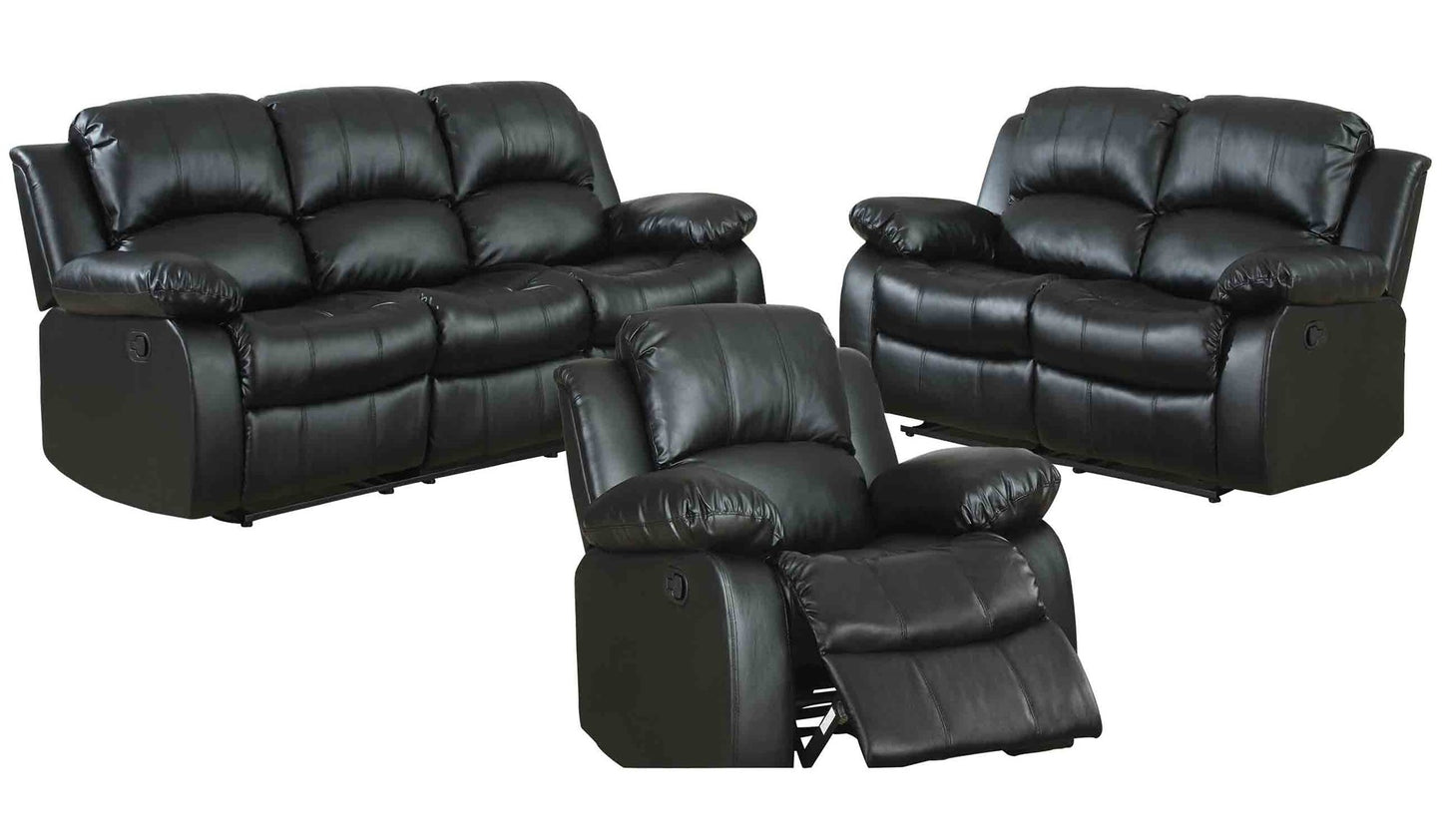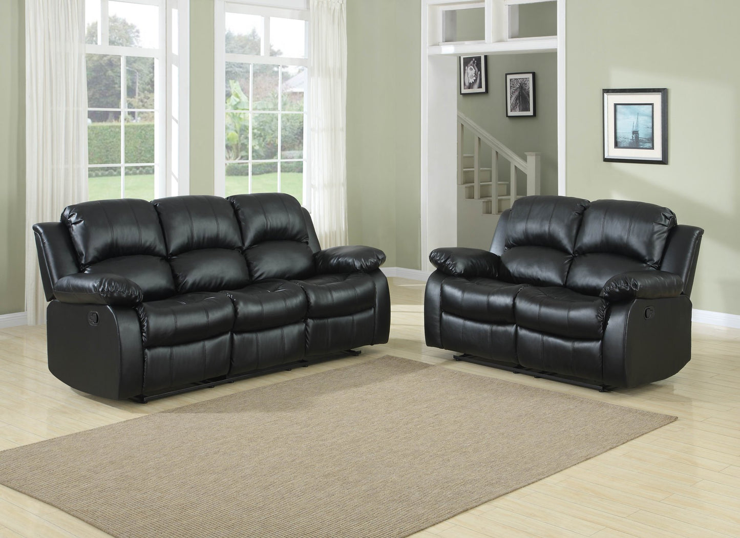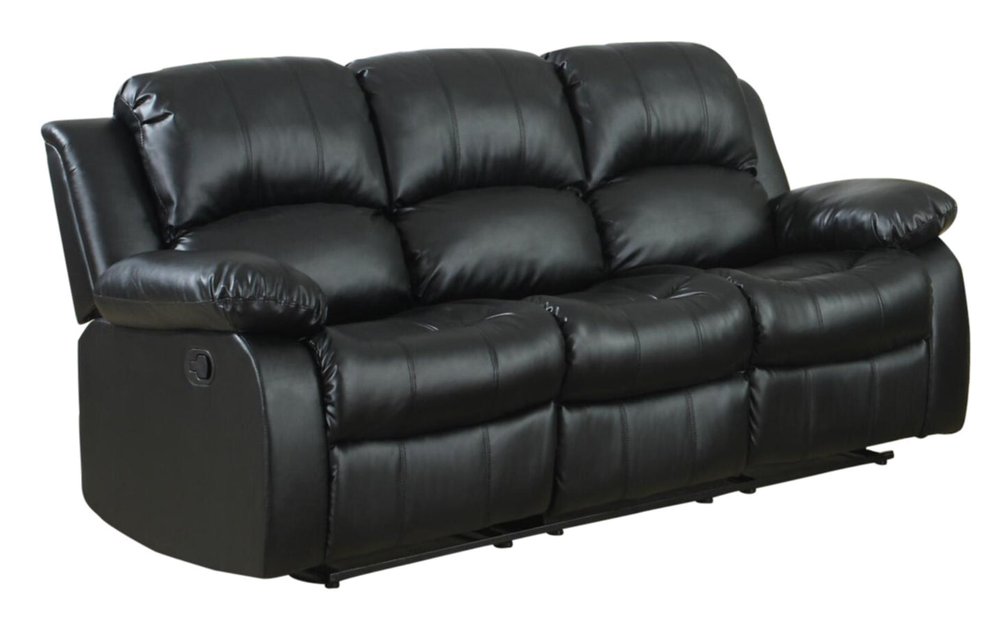 The Homelegance Cranley 3PC Set Double Reclining Sofa, Double Reclining Love Seat & Reclining Chair in Leather - black. The reclining Homelegance Cranley Collection utilizes release mechanism that with a gentle pull sends you straight into your ultimate comfort zone. Tufted bonded leather covers the overstuffed arms, seats and backs furthering the comfort for you, your family and friends. Offered in black or brown.