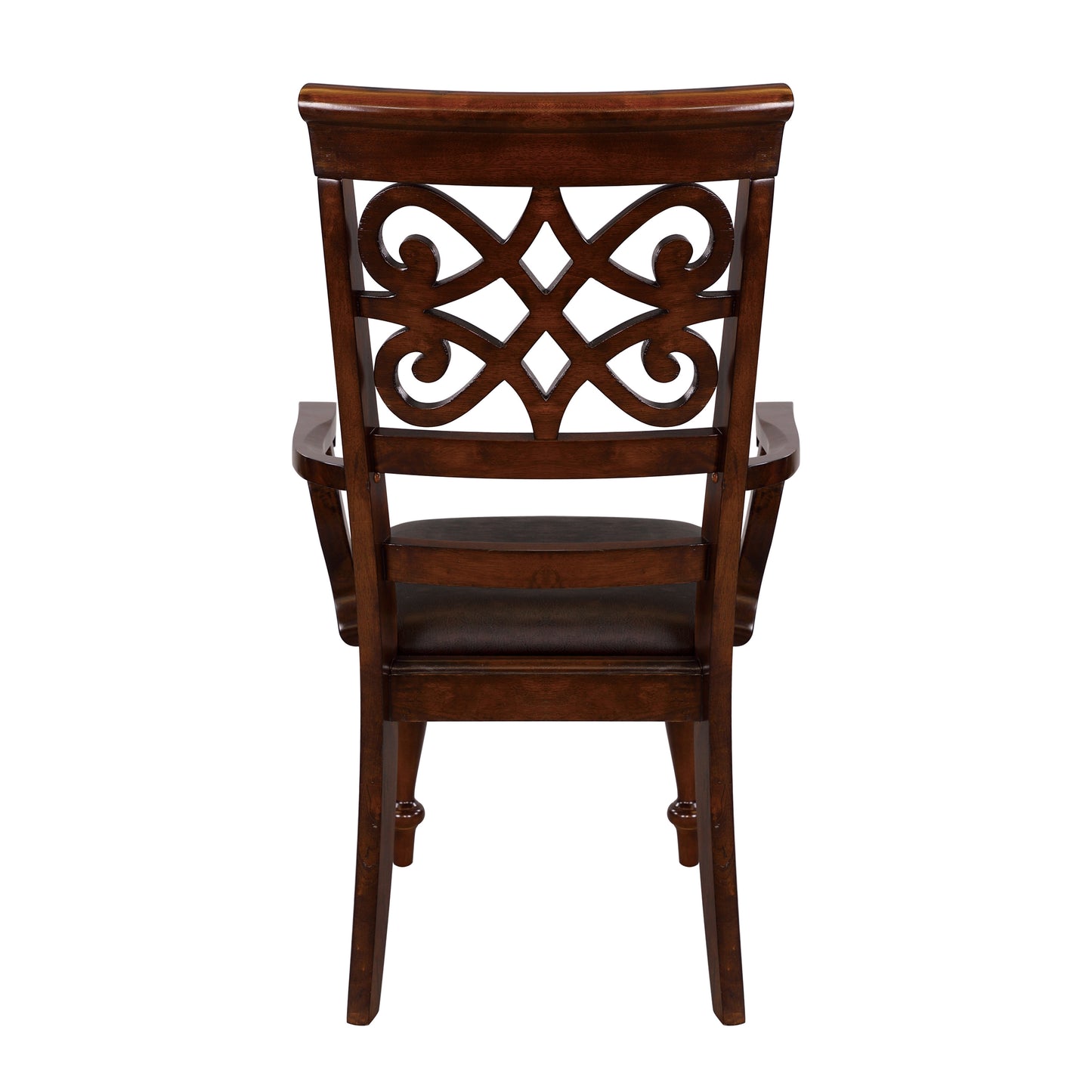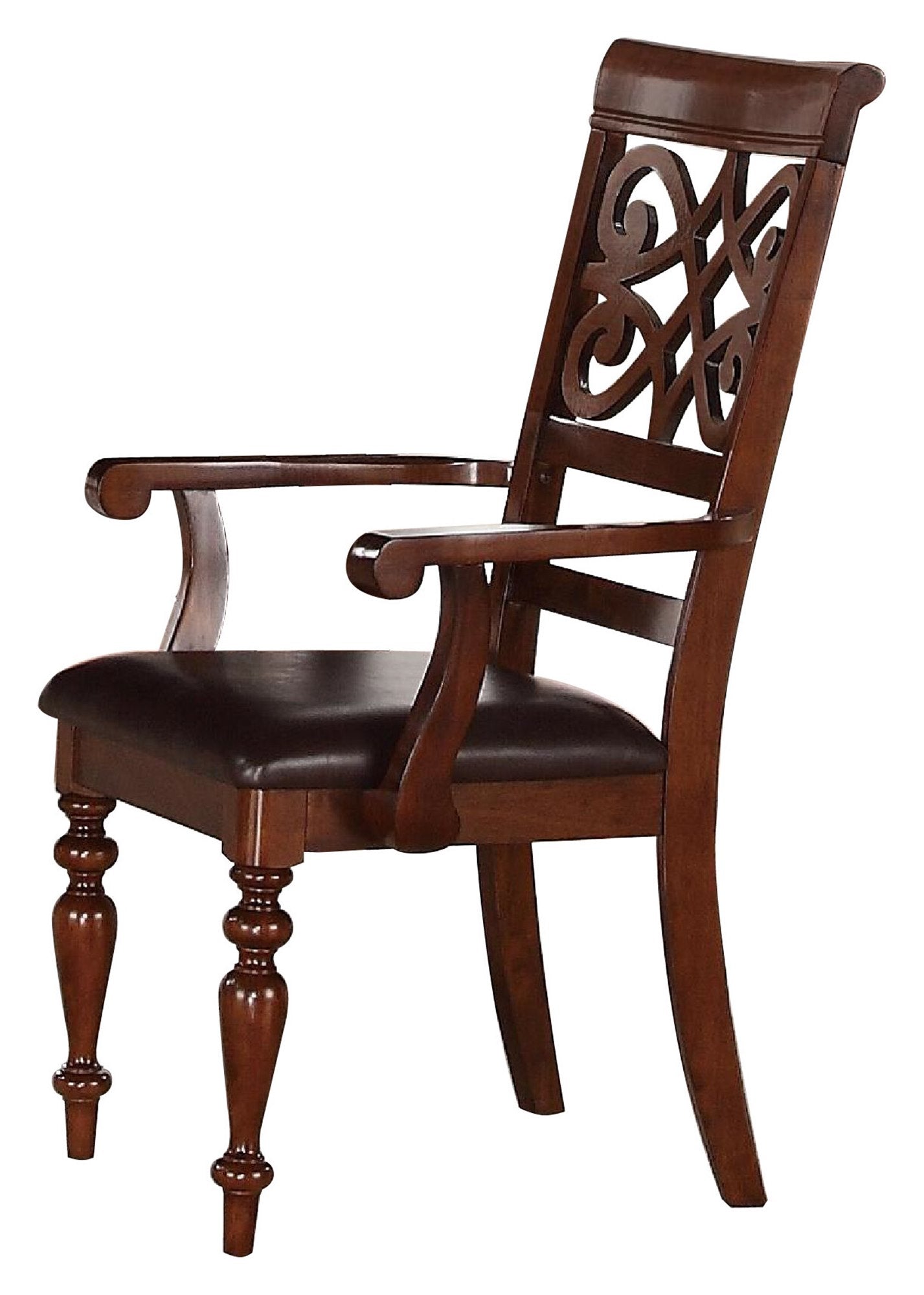 The Homelegance Creswell 2 Dining Arm Chair in Rich Cherry. Classic elements of traditional style are blended to create an elegant casual dining experience in the Homelegance Creswell Collection. A rich cherry finish compliments the veneer pattern, lending to the traditional look, with turned legs further enhancing the look of the table, server, and side chairs. The intertwining curves of the chair backs continue their design on the door fronts of the coordinating server. Each chair features padded seating covered with dark brown bi-cast vinyl.