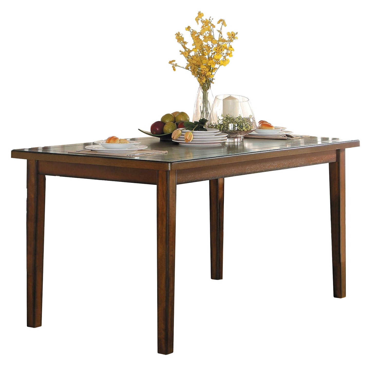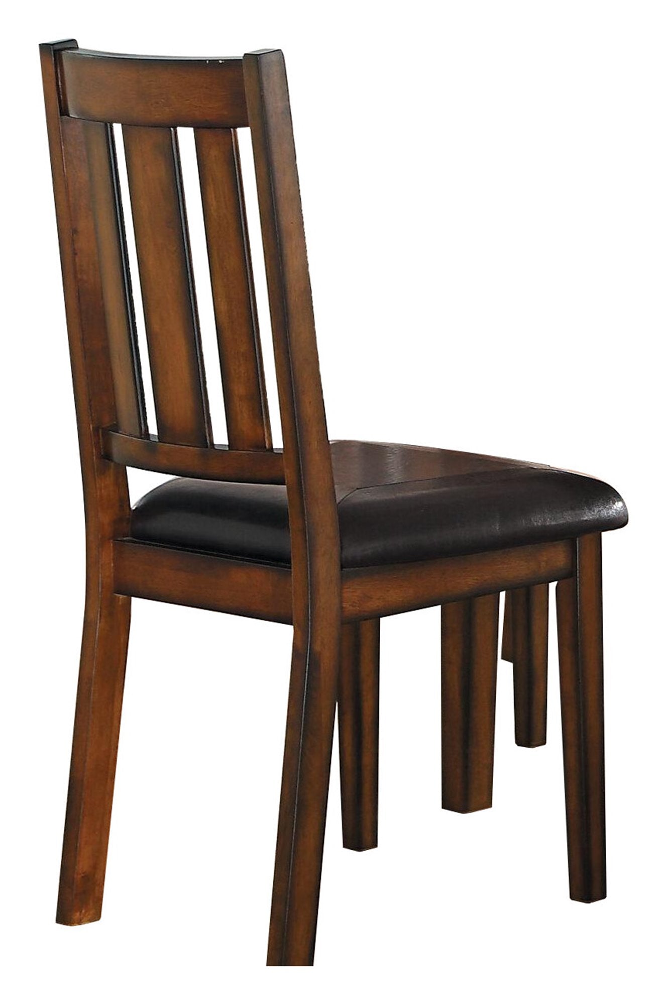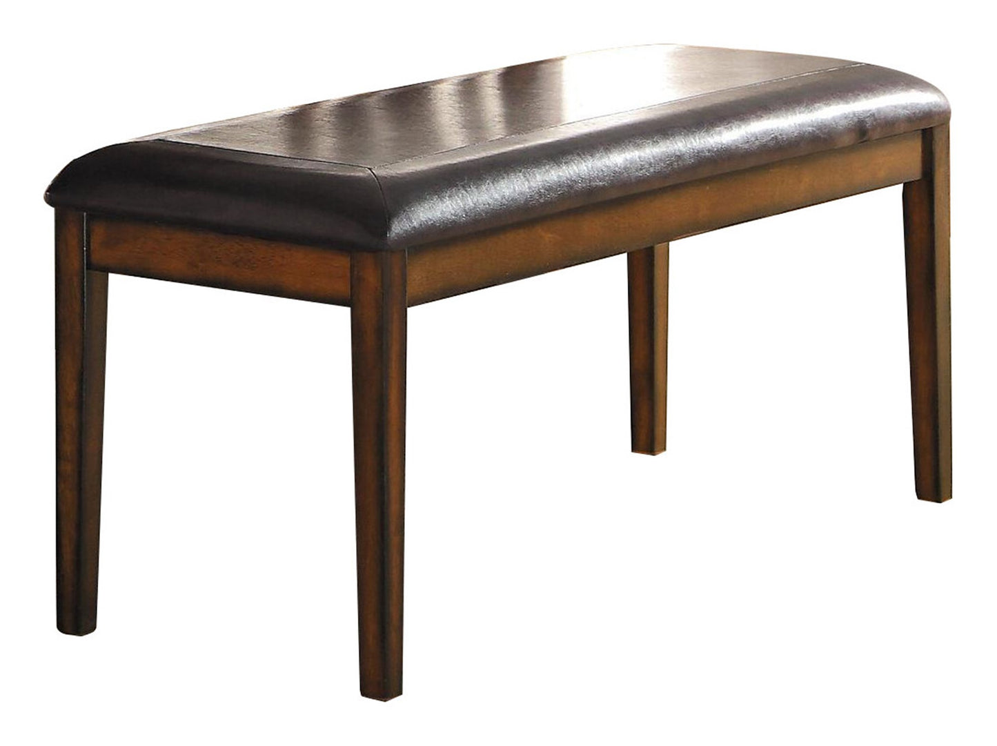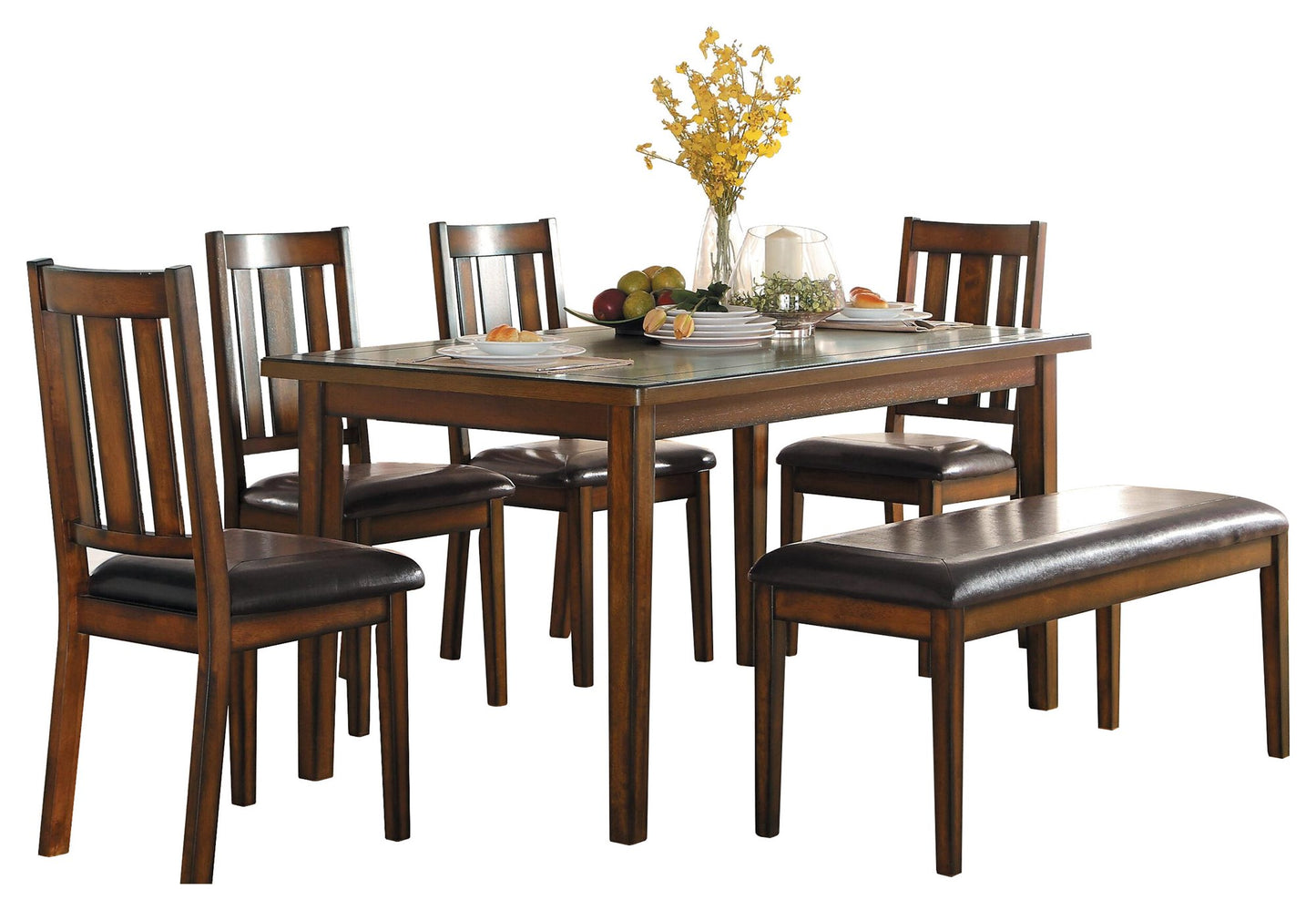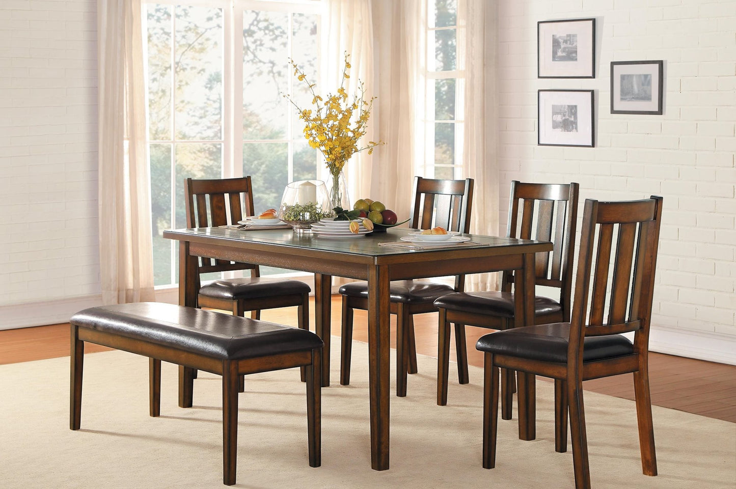 The Homelegance Delmar 6PC Dining Set Table Four Side Chair Bench in Brown. The burnished finish and classic profile of the Homelegance Delmar Collection will be a perfect fit for your modest casual dining space. Splat back wood chairs with brown bi-cast vinyl seats flank the counter and dining height table offerings. Routed detailing provides a linear focal point on the tables tops.