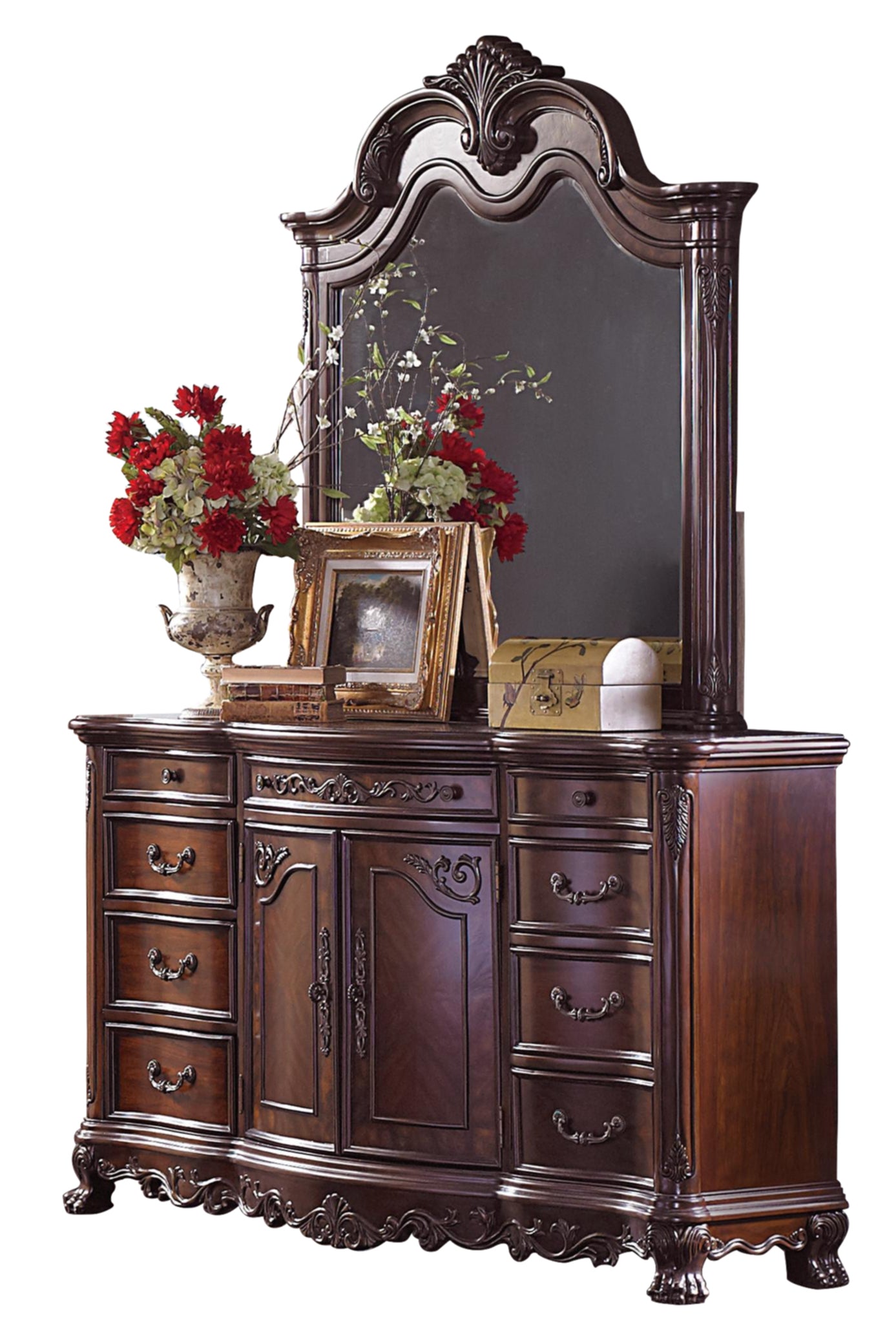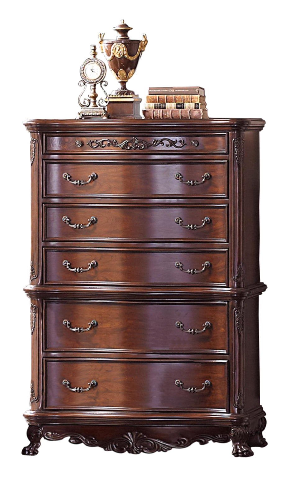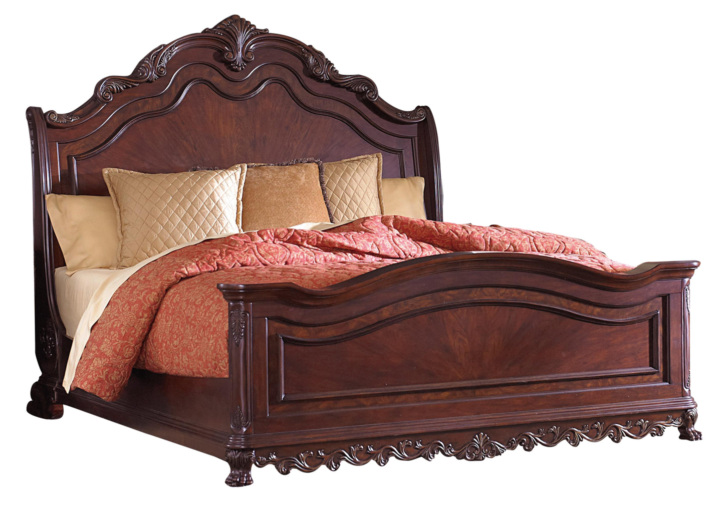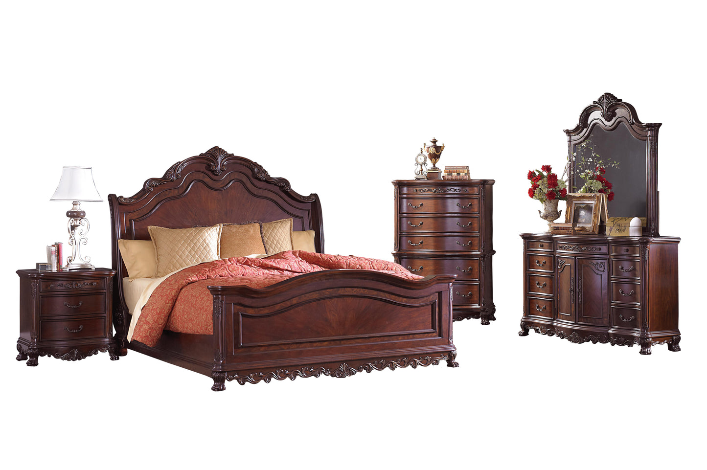 The Homelegance Deryn Park 5PC Bedroom Set E King Sleigh Bed, Dresser, Mirror, Nightstand, Chest in Cherry. Walking into the bedroom that is occupied by the Deadmond Collection immediately displays your love of the traditional aesthetic. Stately from every angle, sophisticated design elements blend to create this beautiful collection. With 2 bed options ��� A graceful sleigh bed or stately poster bed��� the collection allows you the flexibility to fit the scale of your bedroom and the design to accommodate your personal style. Design elements include burl inlay, traditional bale and knob hardware, claw feet and shell motifs. The cherry finish is highlighted by gold tipping that accentuates the traditional feel of elegant Deadmond Collection.