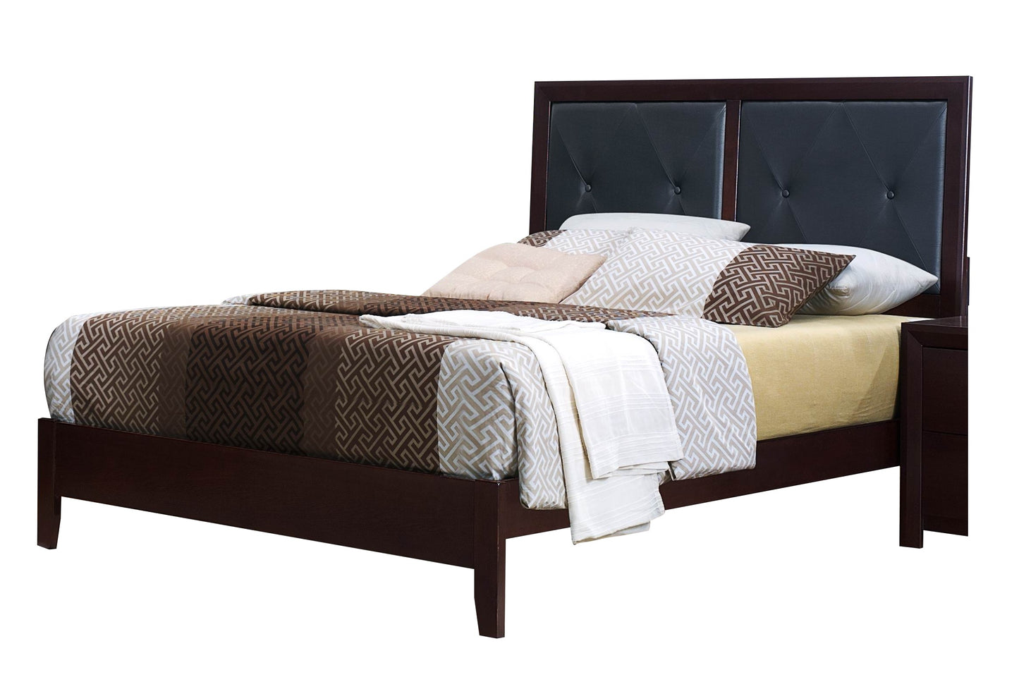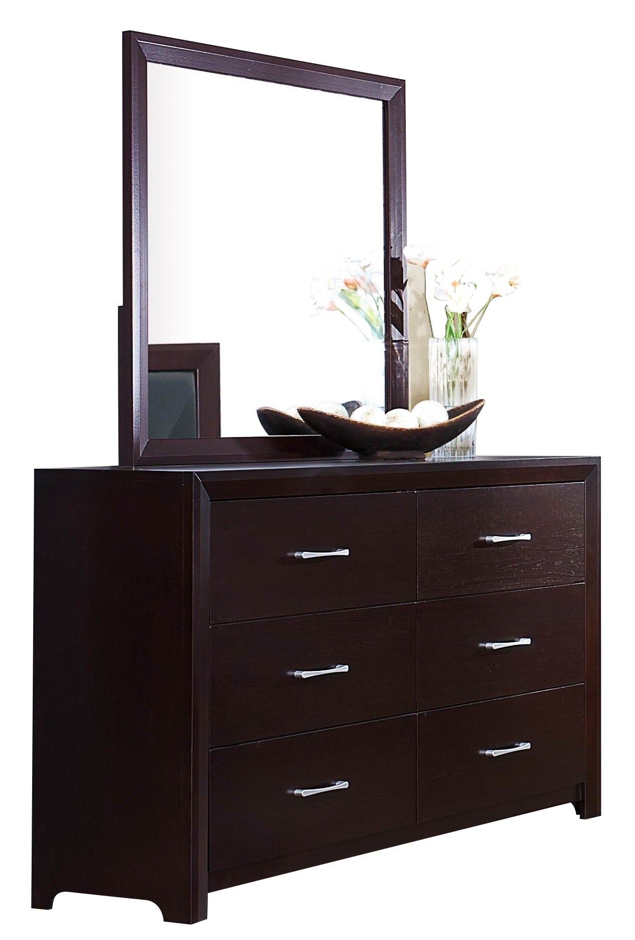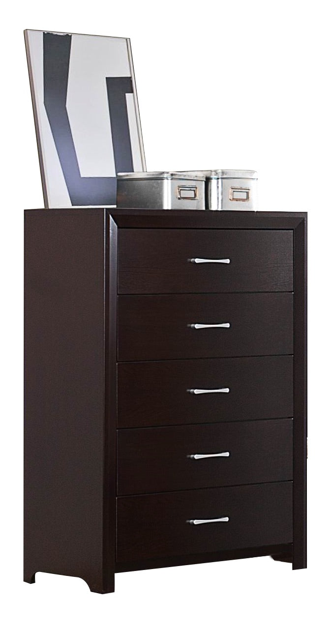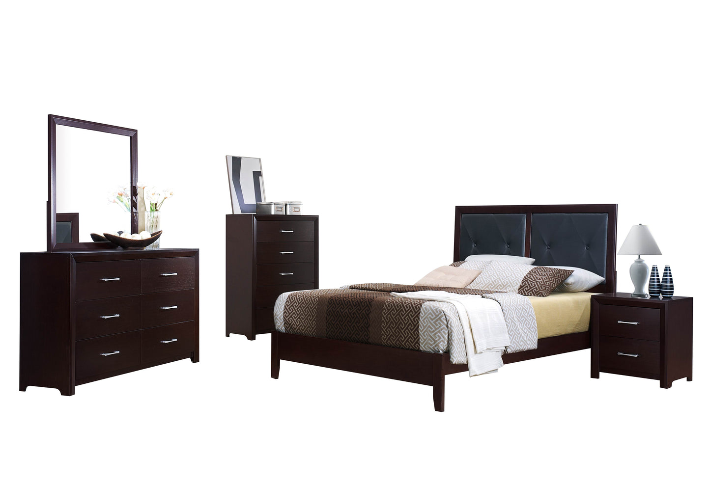 The Eagen Casual 5PC Bedroom Set Cal King Bed, Nightstand, Dresser, Mirror, Chest in Brown Espresso. Enhancing the contemporary design of your bedroom is the focus of the Edina Collection. The espresso-hinted cherry finish builds on the unexaggerated lines of this bedroom suite, blended with the tufted bi-cast vinyl inserts on the headboard and the polished nickel finished hardware, culminates to achieve the modern look. Whether it is a hard contemporary or a softer transitional feel, your d���cor design options are wide open with this classic bedroom collection.