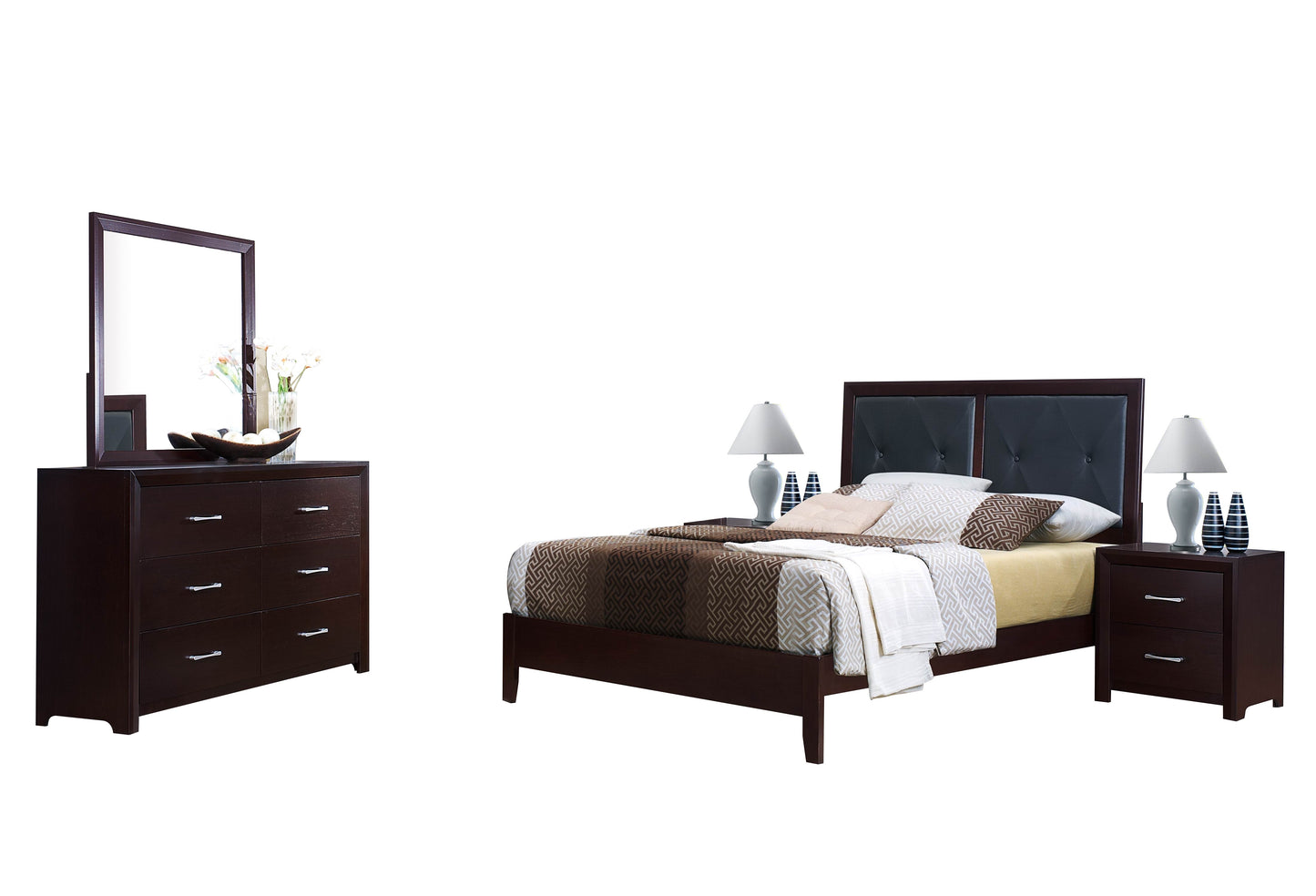 The Eagen Casual 5PC Bedroom Set Queen Bed, 2 Nightstand, Dresser, Mirror in Brown Espresso. Enhancing the contemporary design of your bedroom is the focus of the Edina Collection. The espresso-hinted cherry finish builds on the unexaggerated lines of this bedroom suite, blended with the tufted bi-cast vinyl inserts on the headboard and the polished nickel finished hardware, culminates to achieve the modern look. Whether it is a hard contemporary or a softer transitional feel, your d���������cor design options are wide open with this classic bedroom collection.