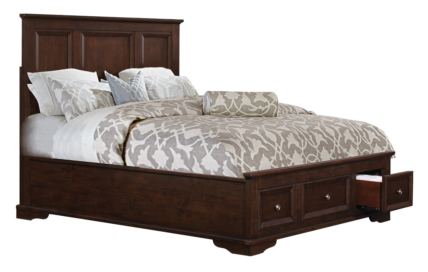 The Elista Rustic Country Full Platform Bed with Footboard Storage in Espresso. Traditional aesthetic doesn�t always have to be grand in scale or accent to achieve a timeless look. The Eunice Collection takes the form of traditional case pieces and utilizes an espresso finish and understated knob hardware to create bedrooms style that can range from transitional to cottage. Recessed framing carries over from the design of the headboard to the drawer fronts of the case pieces and storage footboard.