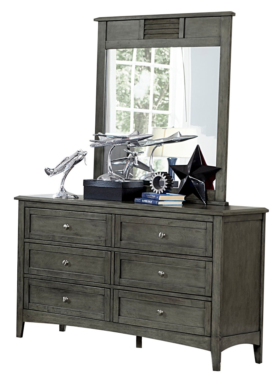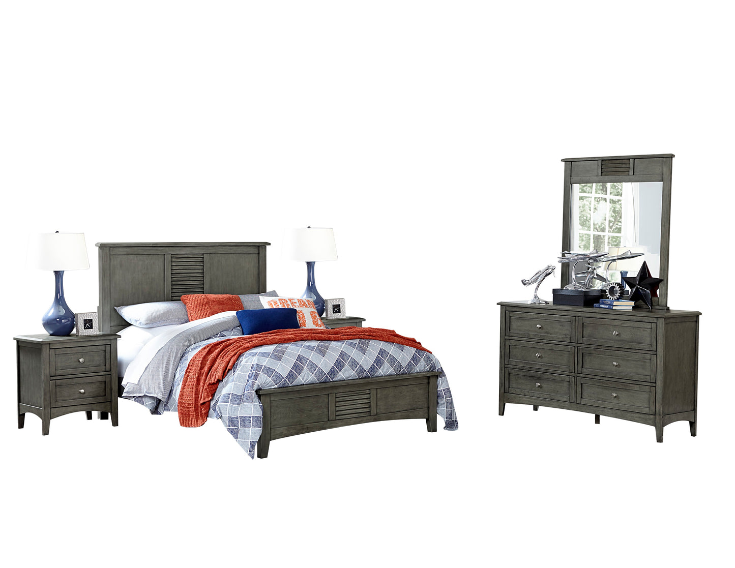 The Gabbert Rustic 5PC Bedroom Set Queen Bed, Dresser, Mirror, 2 Nightstand in Grey. Transitionally styled for your bedroom is the Garcia Collection. Created for versatile placement within a number of environments the louvered panel accents, distinct framing along with a cool gray finish over birch veneer combine to provide a clean palate for your personal decorative style. Nickel knob hardware provides subtle, yet distinct, contrast to the fronts of each case piece. The available desk is a functional addition to the collection with keyboard tray and drawer storage. The collection is offered in twin, full, queen, eastern king and California king for the perfect fit within your bedroom.