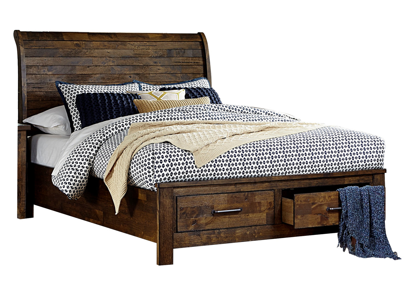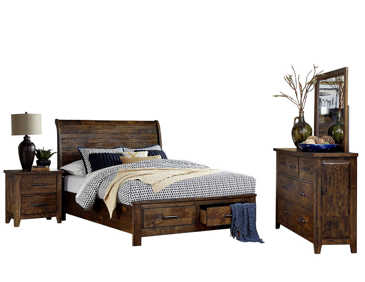 The Jacoby Rustic 4PC Bedroom Set E King Sleigh Storage Bed, Dresser, Mirror, Nightstand in Country Brown. Classic transitional design serves as a base for the natural qualities of the solid wood utilized to create the rustic look of the Jerrick Collection. Metal hardware furthers the authentic rustic look while a burnished finish serves to highlight the wood grain while allowing each plank to serve as a unique accent to the overall design.