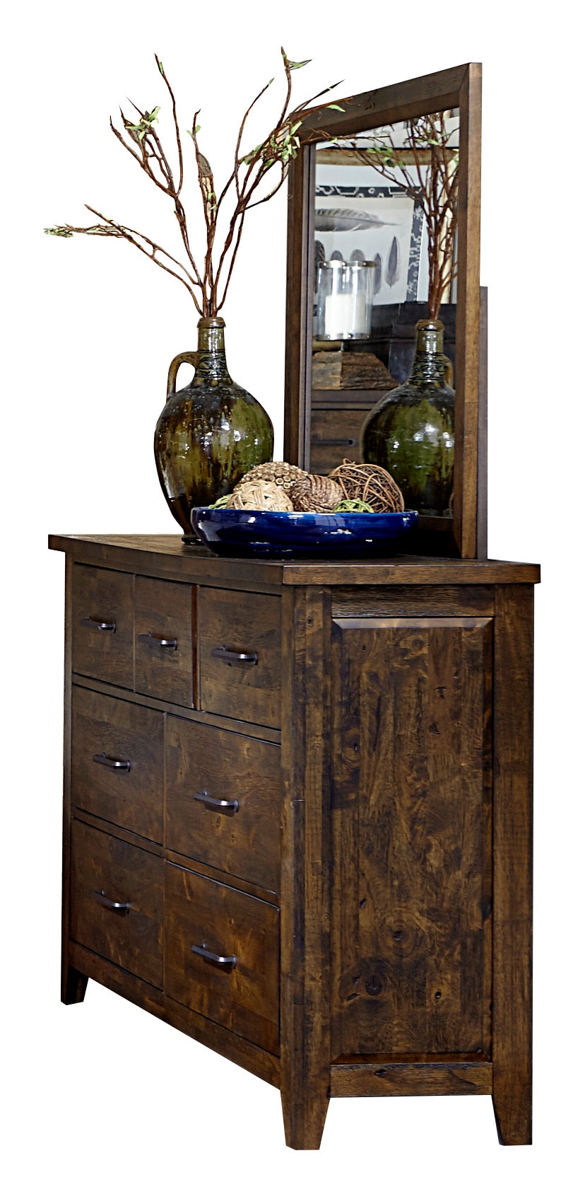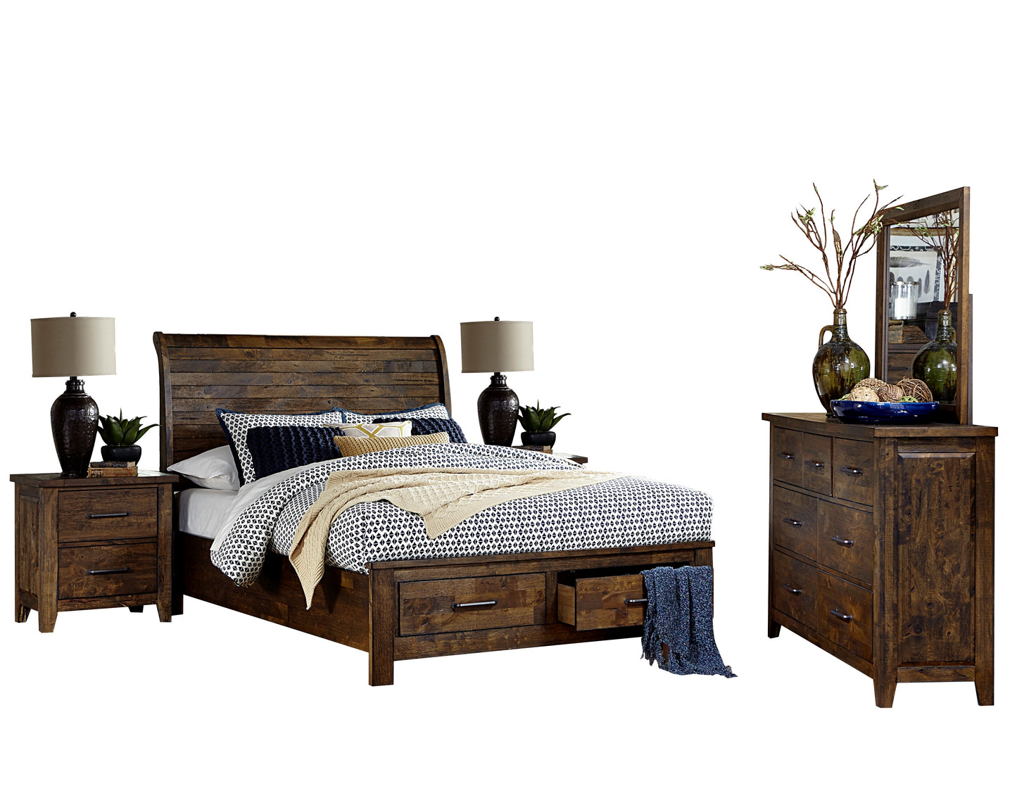 The Jacoby Rustic 5PC Bedroom Set Queen Sleigh Storage Bed, Dresser, Mirror, 2 Nightstand in Country Brown. Classic transitional design serves as a base for the natural qualities of the solid wood utilized to create the rustic look of the Jerrick Collection. Metal hardware furthers the authentic rustic look while a burnished finish serves to highlight the wood grain while allowing each plank to serve as a unique accent to the overall design.