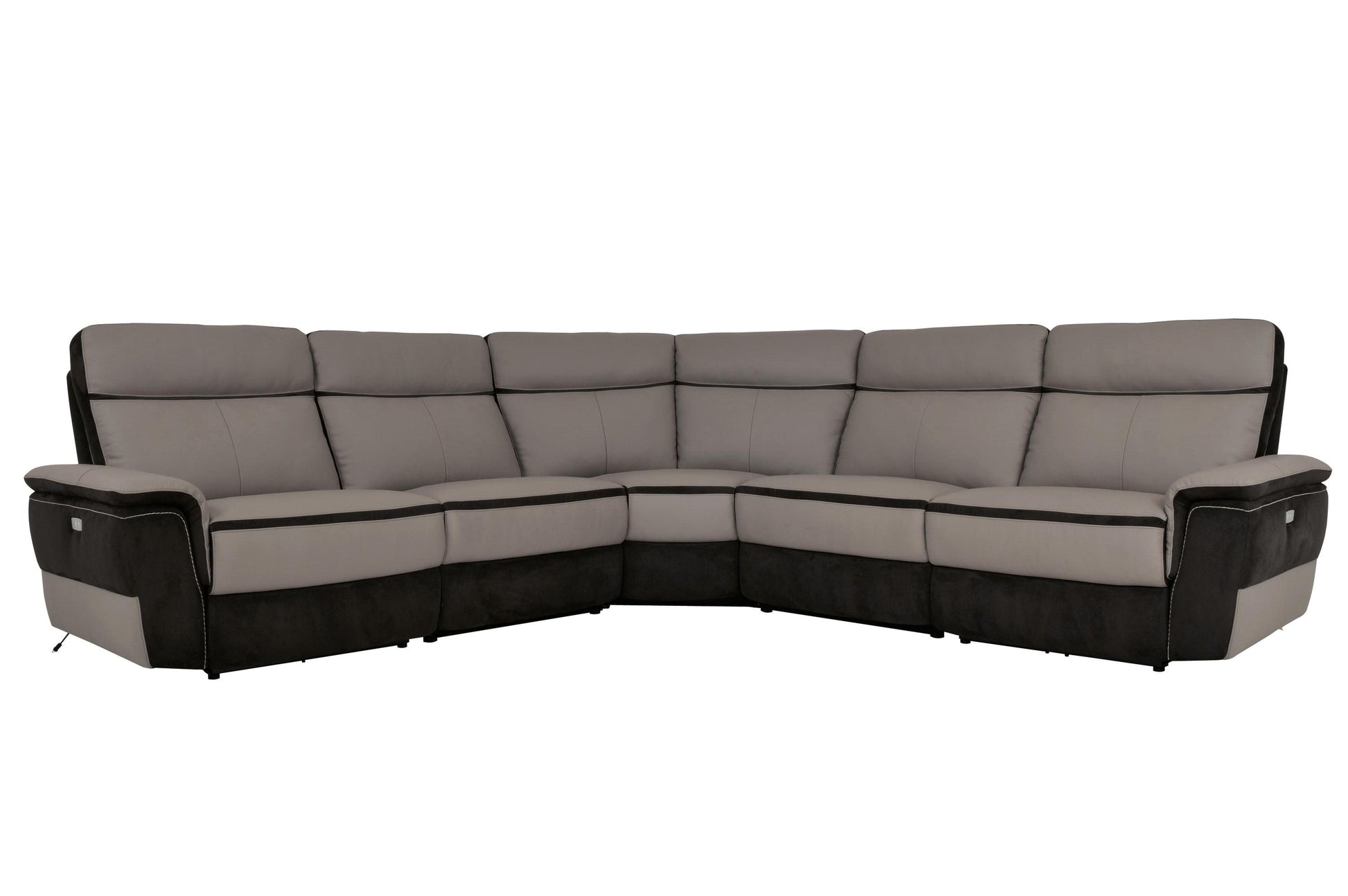 The Homelegance Laertes 5PC Sectional Power Left Side Reclining Chair, Two Power Armless Reclining Chair, Corner Seat & Power Right Side Reclining Chair in top Grain Leather and Fabric - Grey. Providing ample seating for your friends and family is the Homelegance Laertes Collection. The classic sectional shape is book-ended by stationary chaise options or USB port enhanced end power recliners. Taupe gray top grain leather provides a gentle touch while darker tone fabric lends stark contrast. The power reclining mechanism bring you to your desired position with a touch of the button. The collection is available in several different configurations to choose from to complete your seating arrangement.