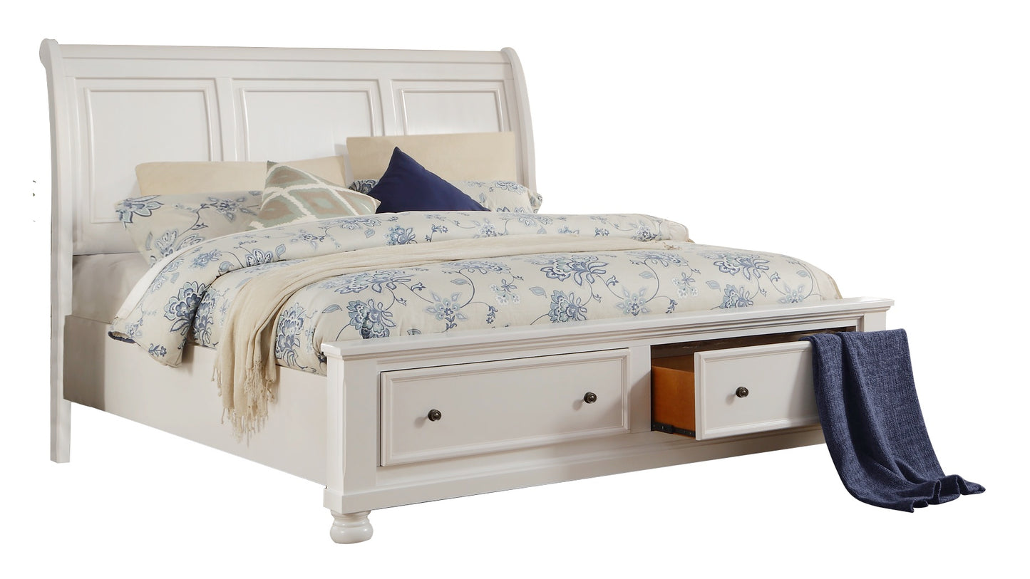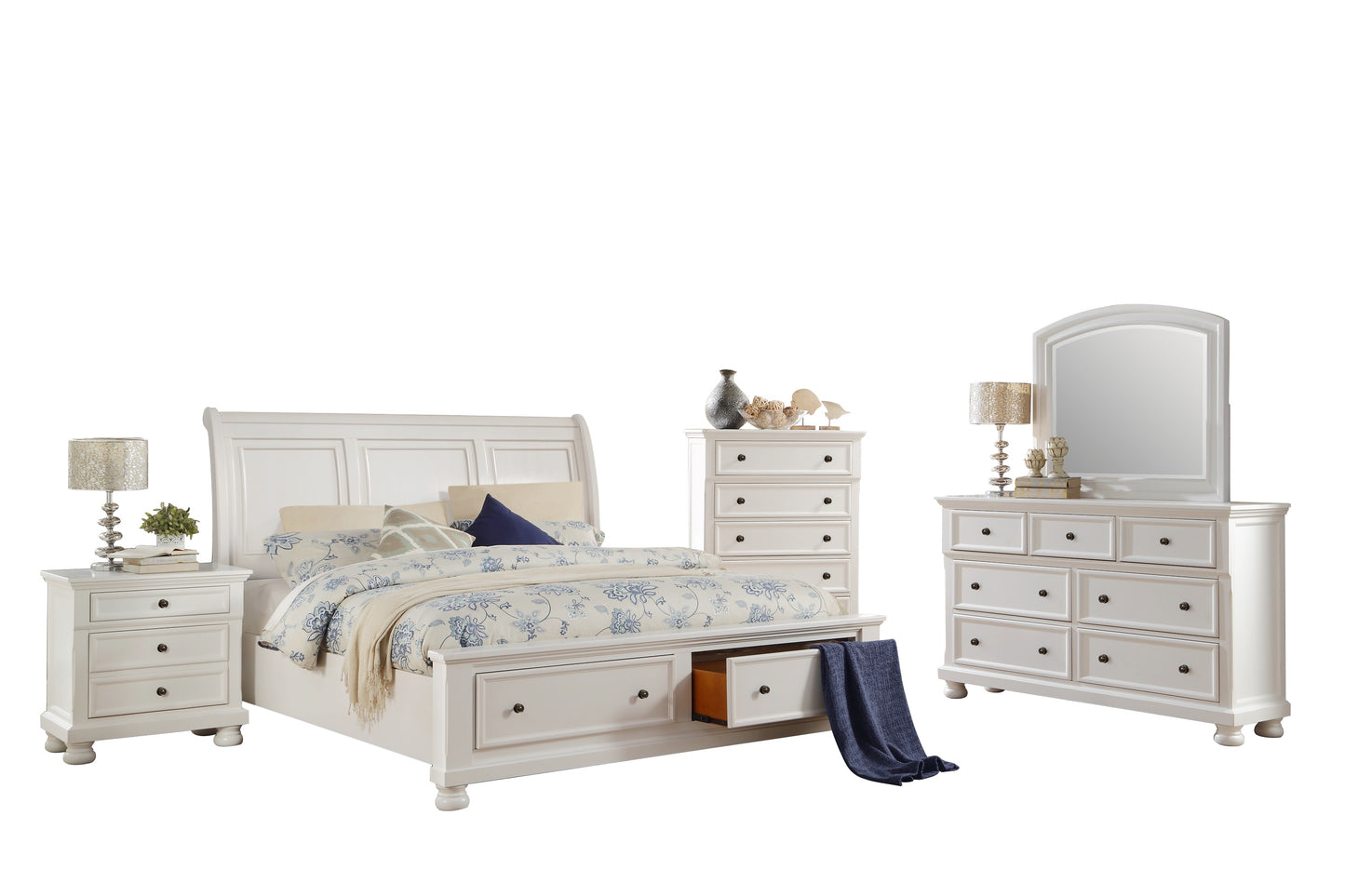 The Lexington Cottage 5PC Bedroom Set E King Sleigh Storage Bed, Dresser, Mirror, Nightstand, Chest in White Finish. Casual transitional styling lends versatility to the placement of the Laurelin Collection in a number of bedroom settings. Black and White sand-through finishes are available creating distinctly different looks from traditional to country casual, with antiqued bronze knob hardware punctuating the look of each framed drawer front. Hidden drawers in the nightstand and dresser provide discrete storage for your valuables, while the storage drawers of the footboard provide a more visible means of additional storage capability. Bun feet support the case goods and a sleigh headboard finish off the transitional design of the collection.