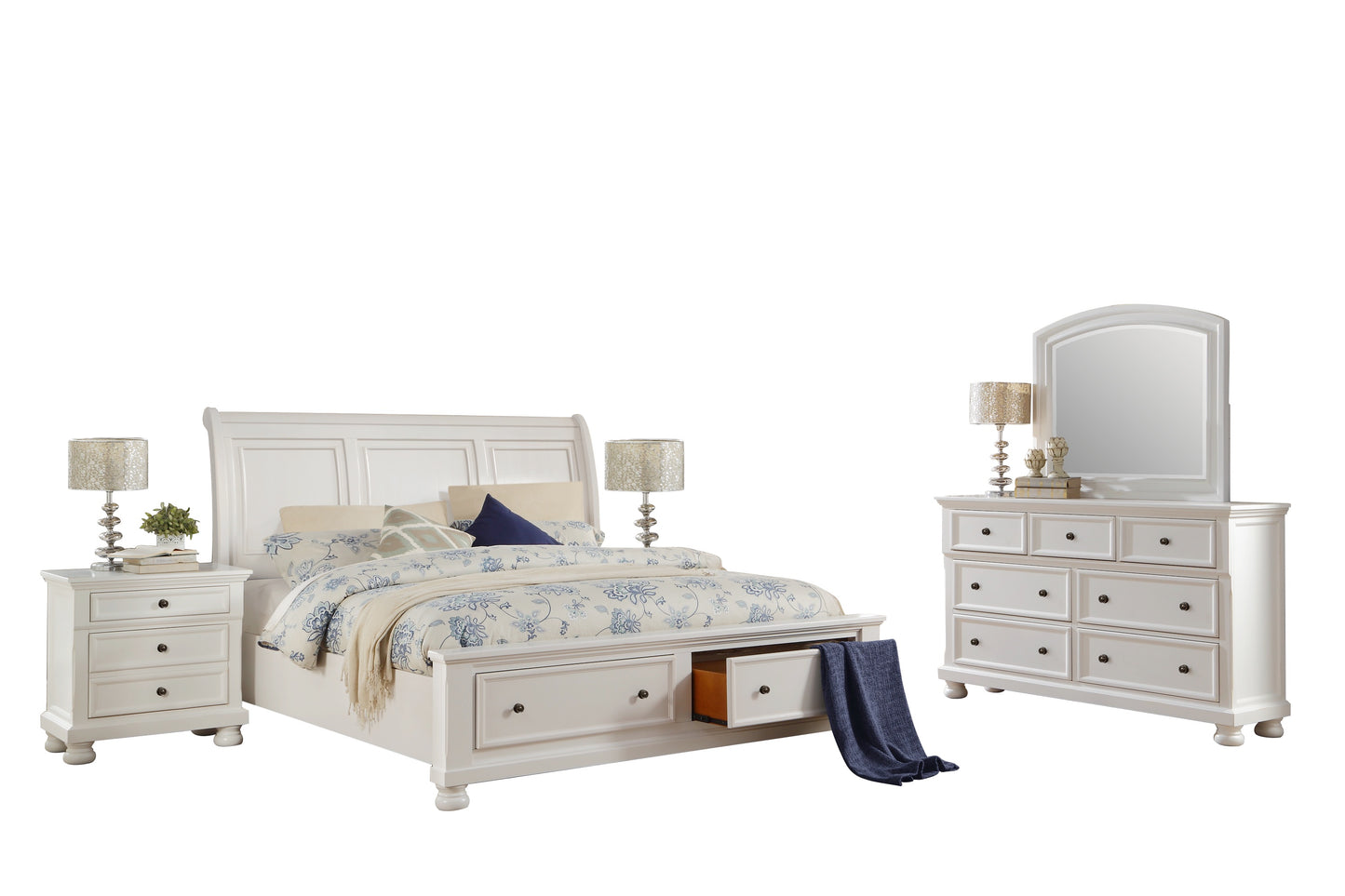 The Lexington Cottage 5PC Bedroom Set Queen Sleigh Storage Bed, Dresser, Mirror, 2 Nightstand in White Finish. Casual transitional styling lends versatility to the placement of the Laurelin Collection in a number of bedroom settings. Black and White sand-through finishes are available creating distinctly different looks from traditional to country casual, with antiqued bronze knob hardware punctuating the look of each framed drawer front. Hidden drawers in the nightstand and dresser provide discrete storage for your valuables, while the storage drawers of the footboard provide a more visible means of additional storage capability. Bun feet support the case goods and a sleigh headboard finish off the transitional design of the collection.