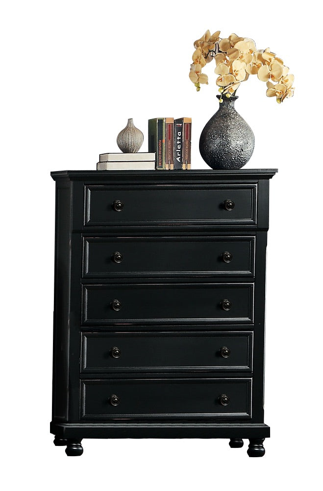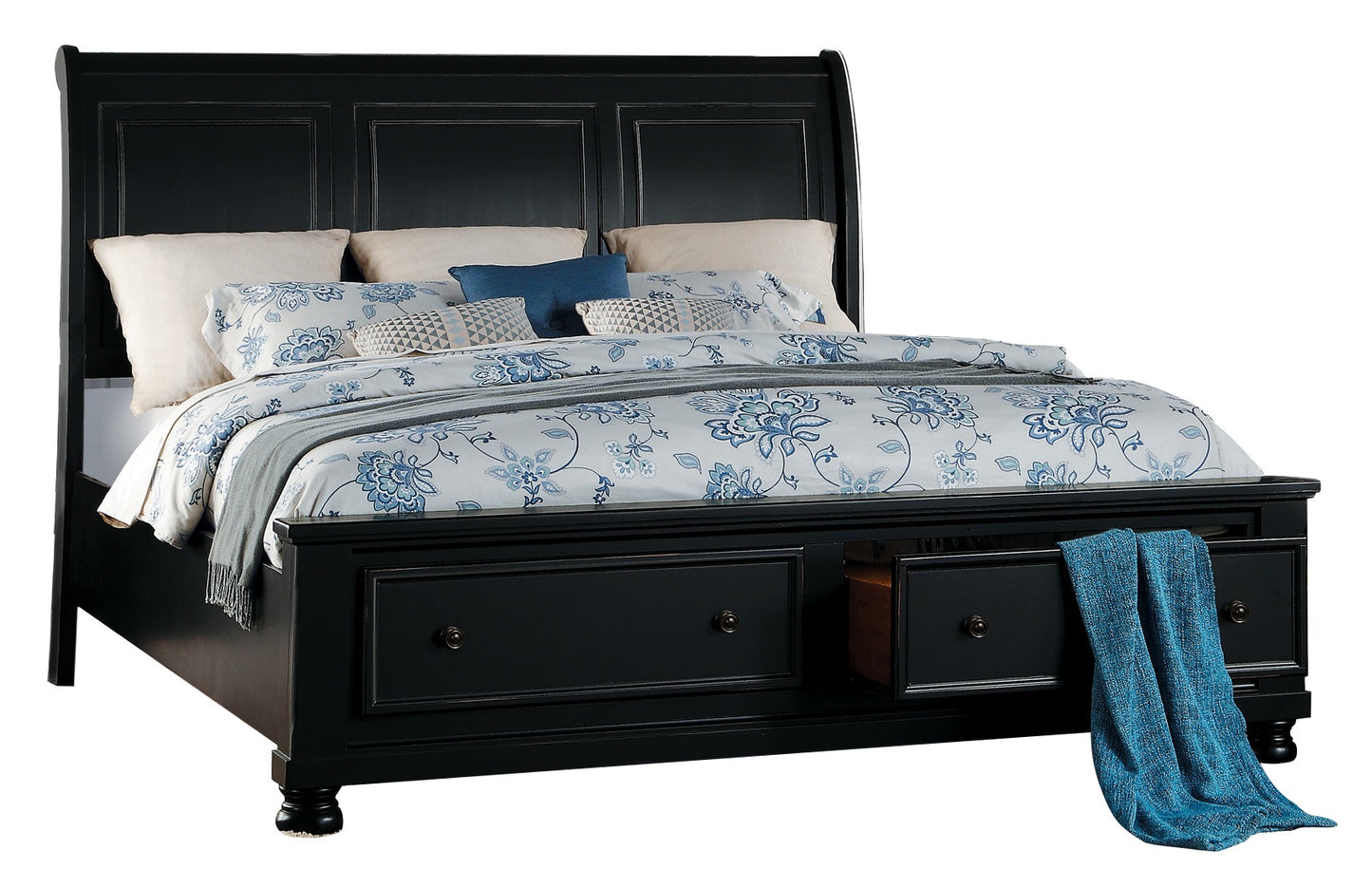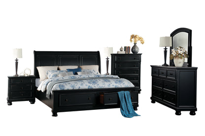 The Lexington Cottage 6PC Bedroom Set Queen Sleigh Storage Bed, Dresser, Mirror, 2 Nightstand, Chest in Black Finish. Casual transitional styling lends versatility to the placement of the Laurelin Collection in a number of bedroom settings. Black and White sand-through finishes are available creating distinctly different looks from traditional to country casual, with antiqued bronze knob hardware punctuating the look of each framed drawer front. Hidden drawers in the nightstand and dresser provide discrete storage for your valuables, while the storage drawers of the footboard provide a more visible means of additional storage capability. Bun feet support the case goods and a sleigh headboard finish off the transitional design of the collection.
