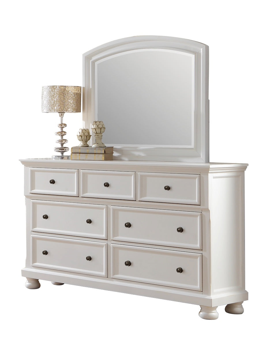 The Lexington Cottage 6PC Bedroom Set Queen Sleigh Storage Bed, Dresser, Mirror, 2 Nightstand, Chest in White Finish. Casual transitional styling lends versatility to the placement of the Laurelin Collection in a number of bedroom settings. Black and White sand-through finishes are available creating distinctly different looks from traditional to country casual, with antiqued bronze knob hardware punctuating the look of each framed drawer front. Hidden drawers in the nightstand and dresser provide discrete storage for your valuables, while the storage drawers of the footboard provide a more visible means of additional storage capability. Bun feet support the case goods and a sleigh headboard finish off the transitional design of the collection.