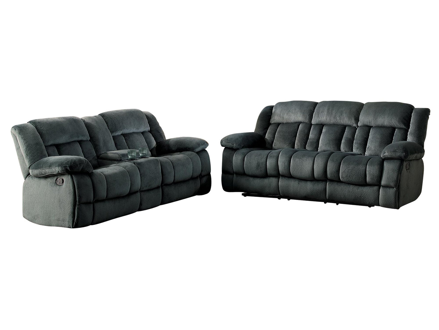 The Homelegance Laurelton 2PC Double Reclining Sofa & Double Glider Reclining Love Seat with Center Console in Microfiber - Charcoal. Generous seating combined with functional touches makes the Laurelton Collection the perfect addition to your living room. The double glider reclining love seat�s center console features dual cup holders and hidden storage. Charcoal and chocolate textured plush microfiber fabric are available as cover options for this amply appointed seating group.