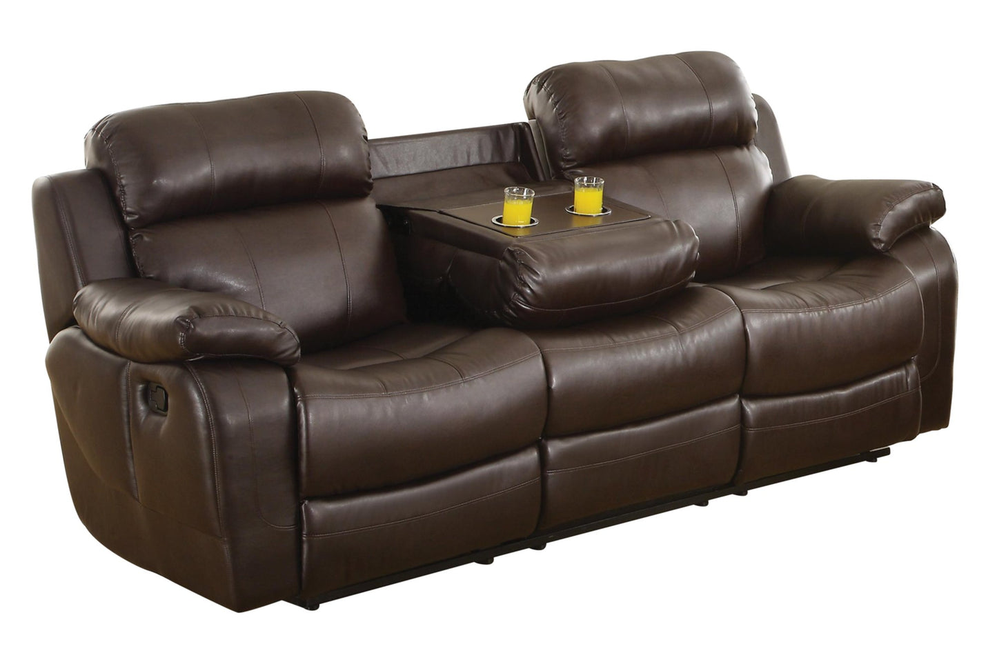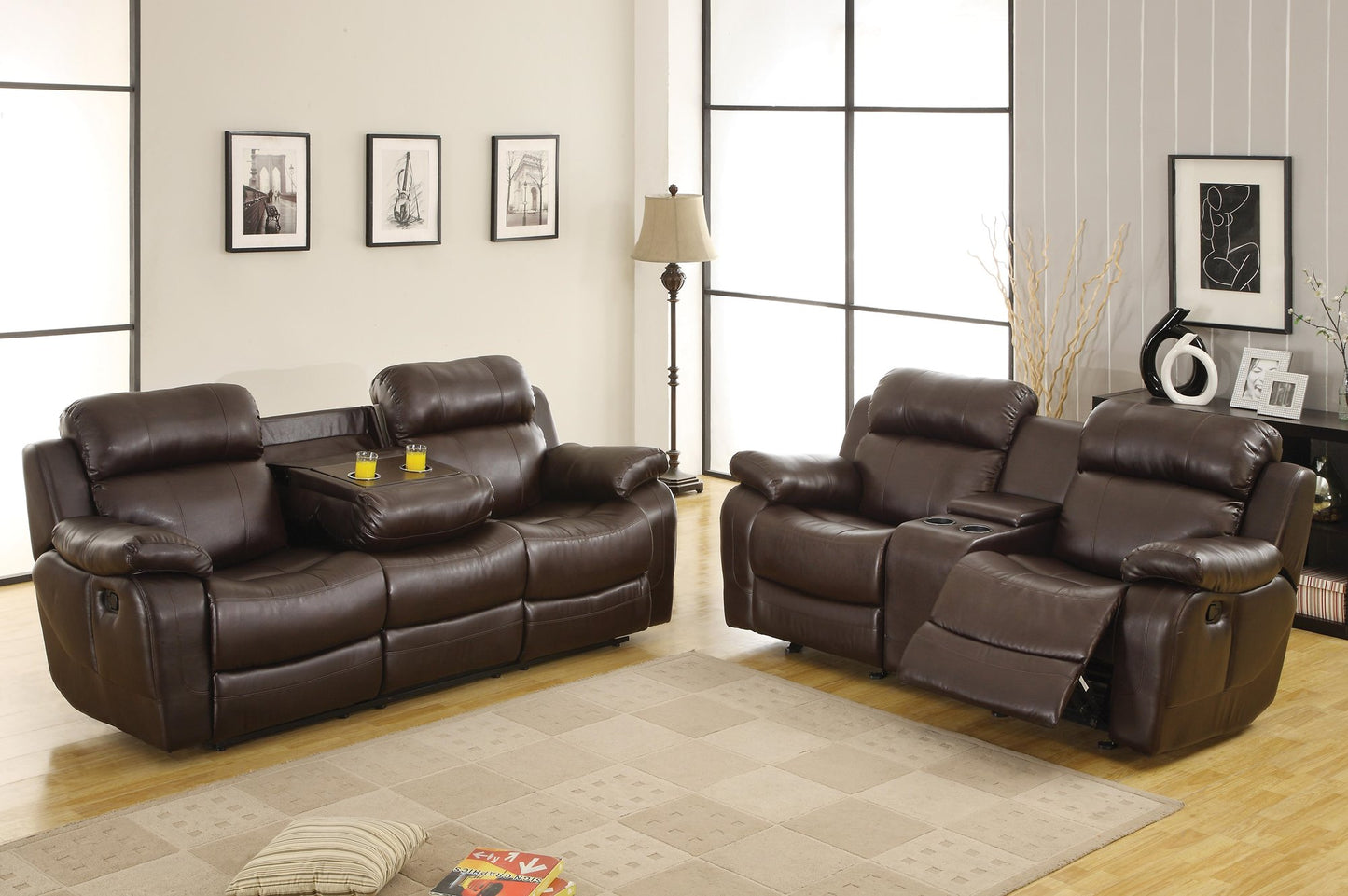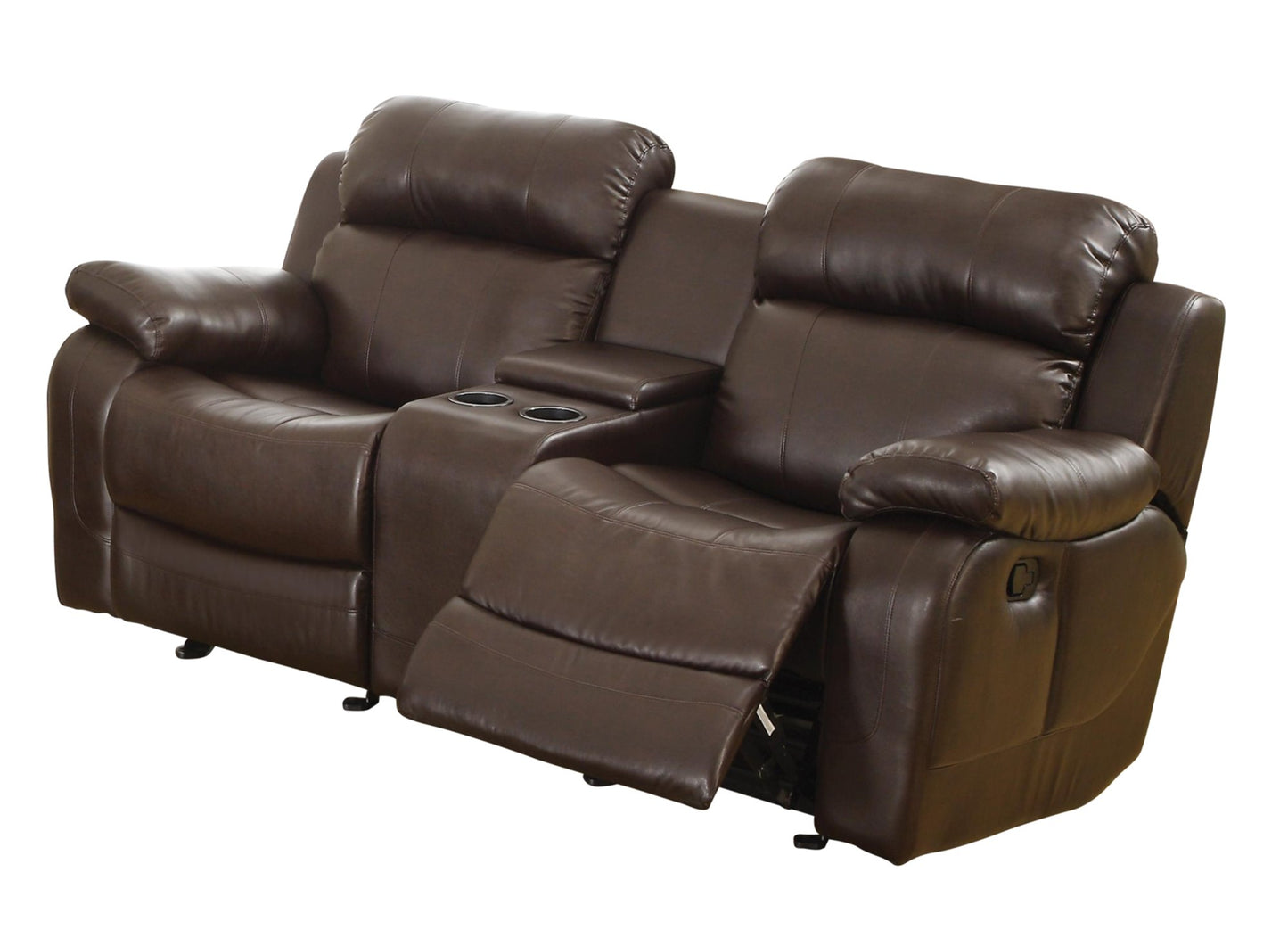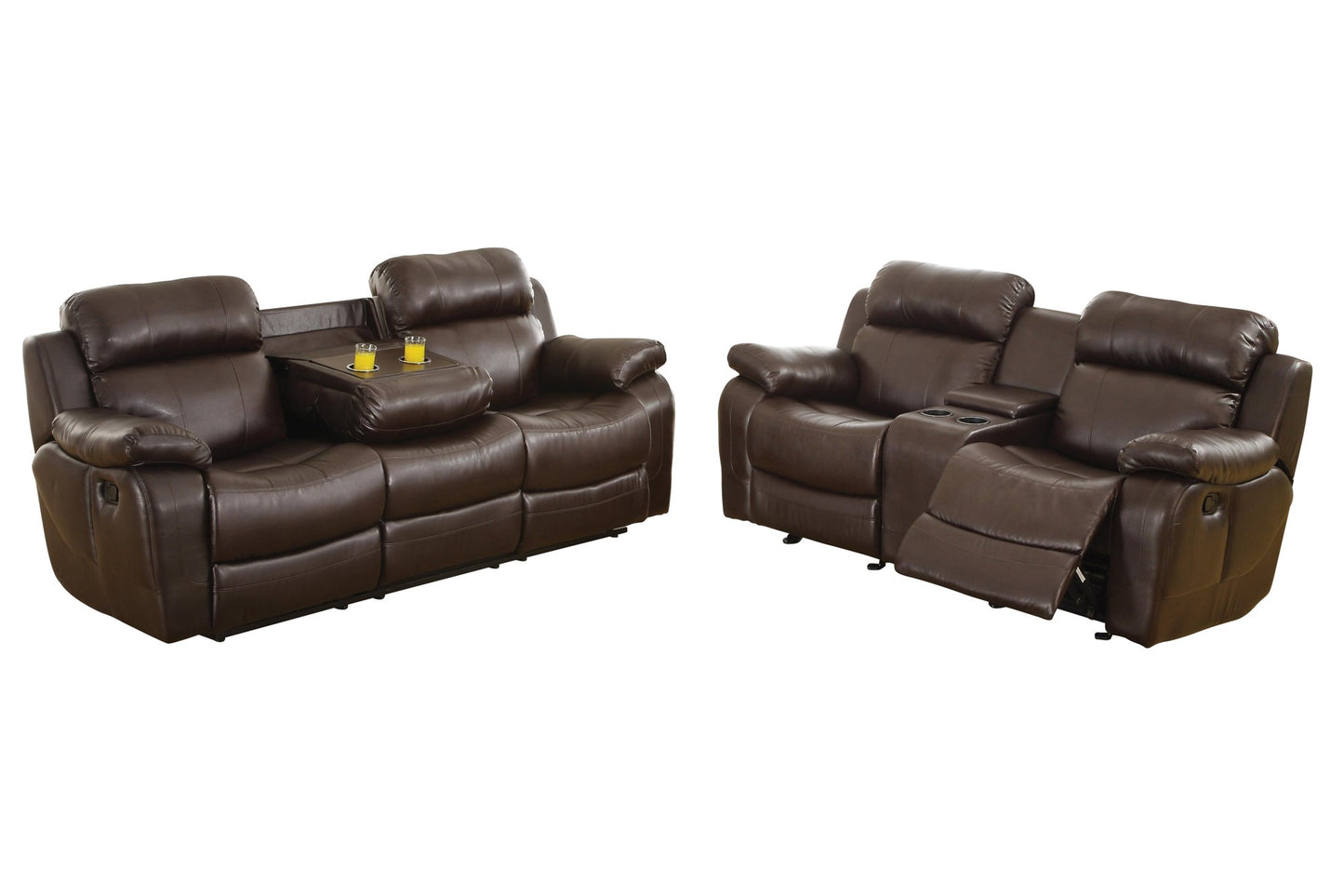 The Homelegance Marille2PC Set Double Reclining Sofa with Center Drop-Down Cup Holders & Double Glider Reclining Love Seat with Center Console in Leather - Dark Brown. With either the extended stretch of the reclining sofa or soothing rock of the reclining chair, your comfort is taken care of in the Homelegance MarilleCollection. Drop-down cup holders add additional function to the collection. The collection is offered in brown bonded leather match, black bonded leather match, dark brown 100% polyester or taupe 100% polyester.